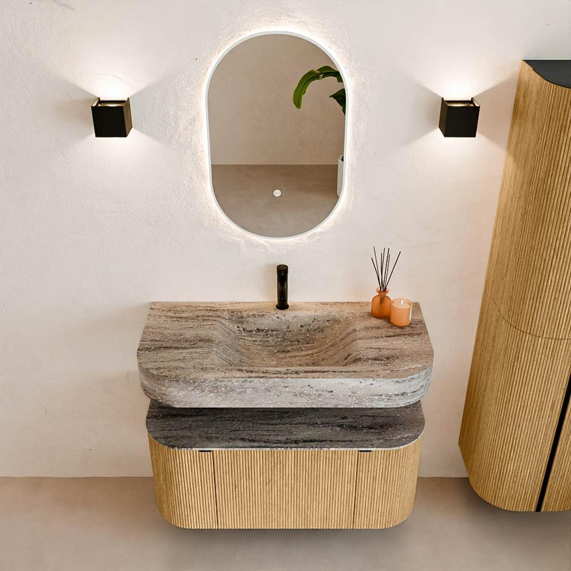 Natuurlijke materialen in warme tinten. De verticale ribbels brengen ritme en textuur in het ontwerp, terwijl het eikenhout zorgt voor een warme, ambachtelijke uitstraling. Kies uit 5 houttinten OAK, WALNUT, DUSK, SHADOW en RUBY zorgvuldig geselecteerde houtkleuren om zowel moderne als klassieke badkamers te verrijken.
