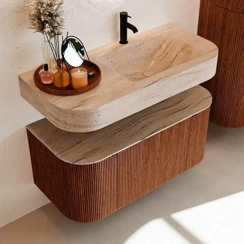 MONDIAZ THOR-DLUX 100cm badmeubel ronding links + rechts kleur Ruby met 1 lade en 2 deuren. Vrijhangende wastafel CLOUD Rechts 1 kraangat kleur Saba.