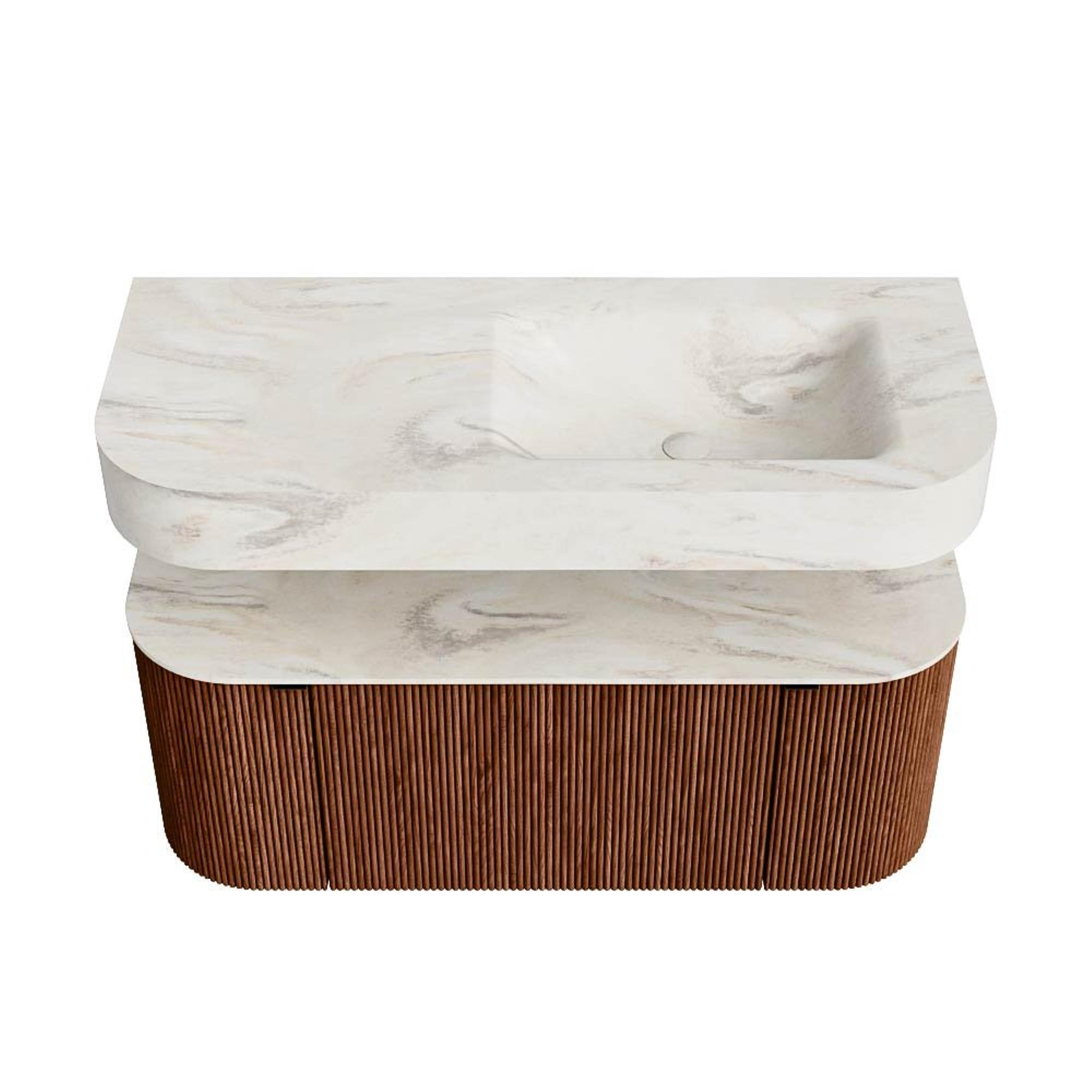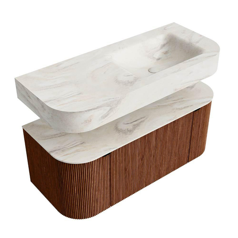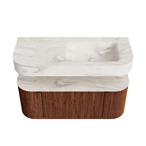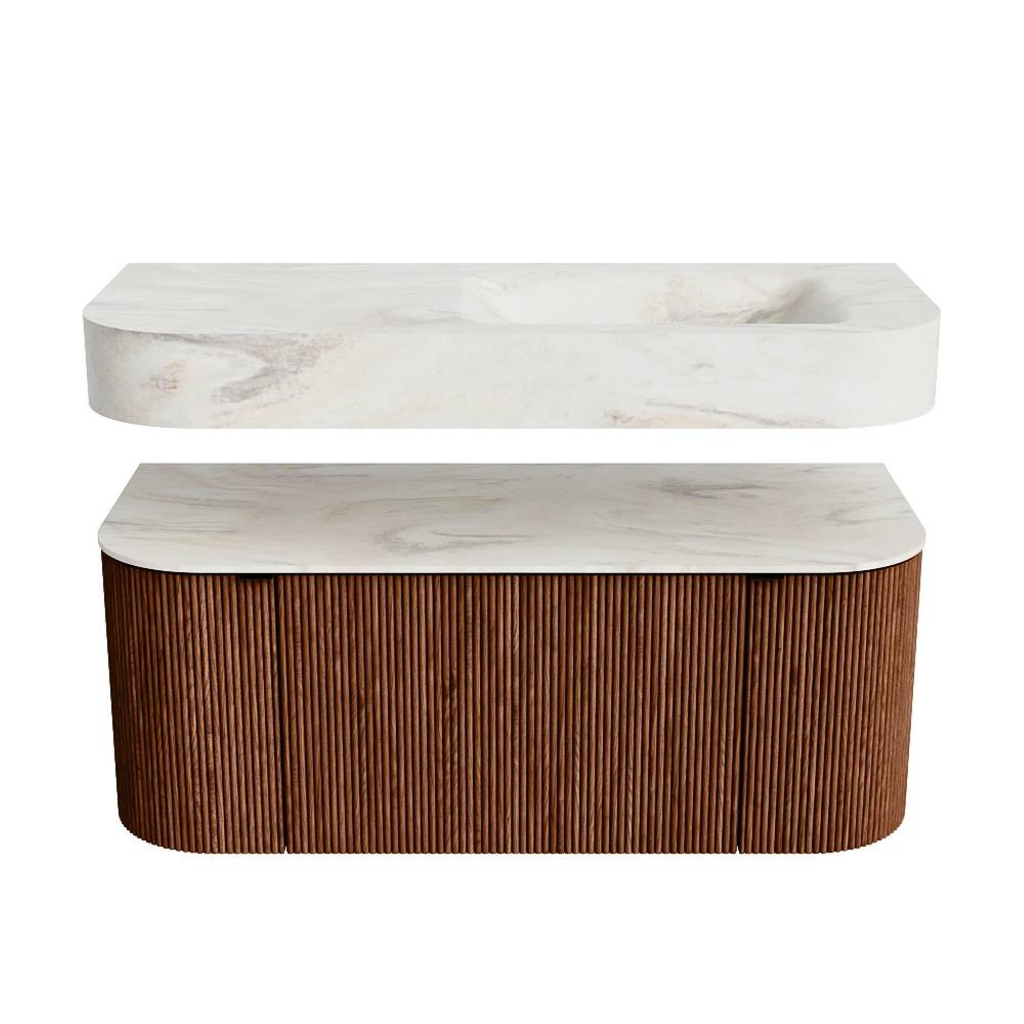 MONDIAZ THOR-DLUX 110cm badmeubel ronding links + rechts kleur Ruby met 1 lade en 2 deuren. Vrijhangende wastafel CLOUD Rechts 1 kraangat kleur Ostra.