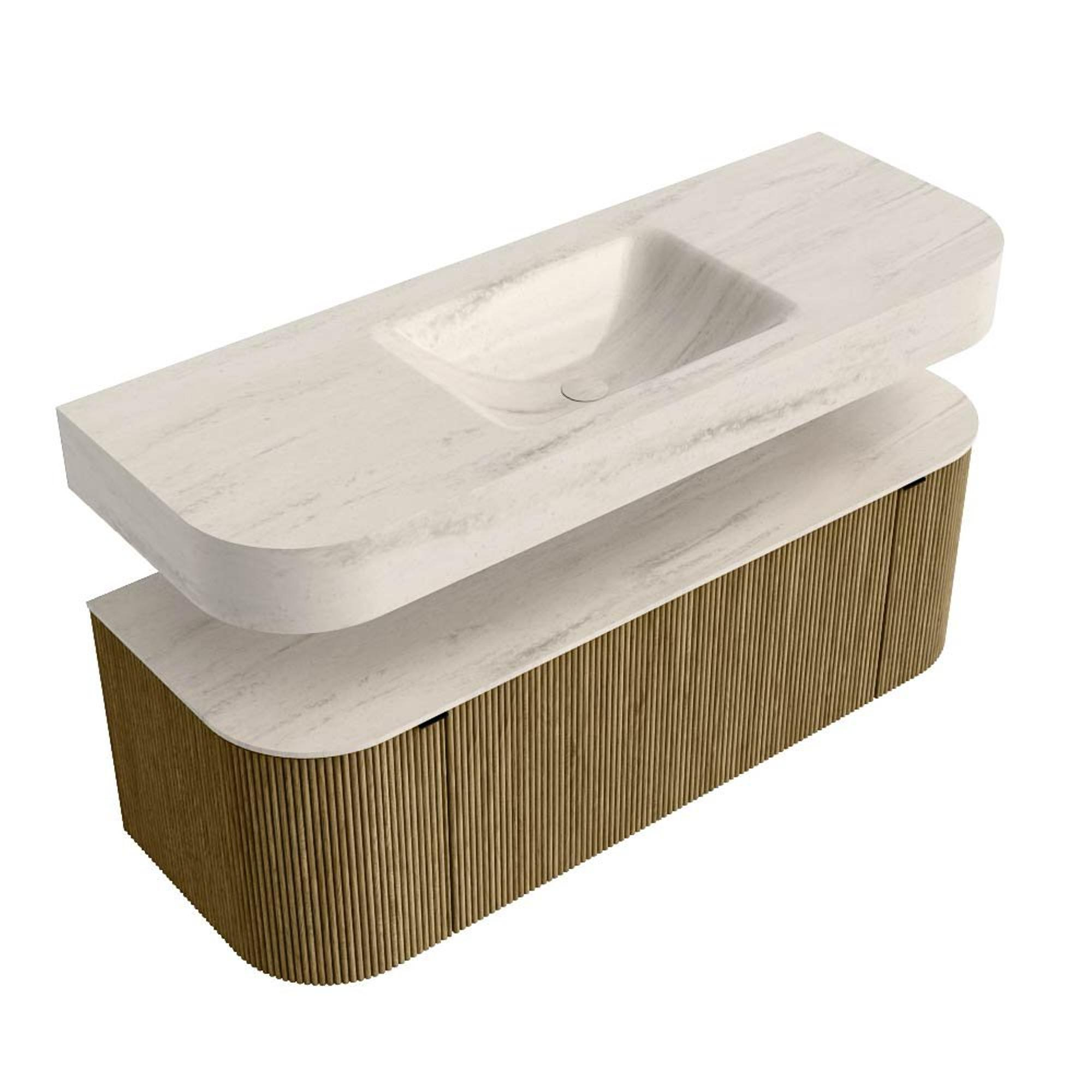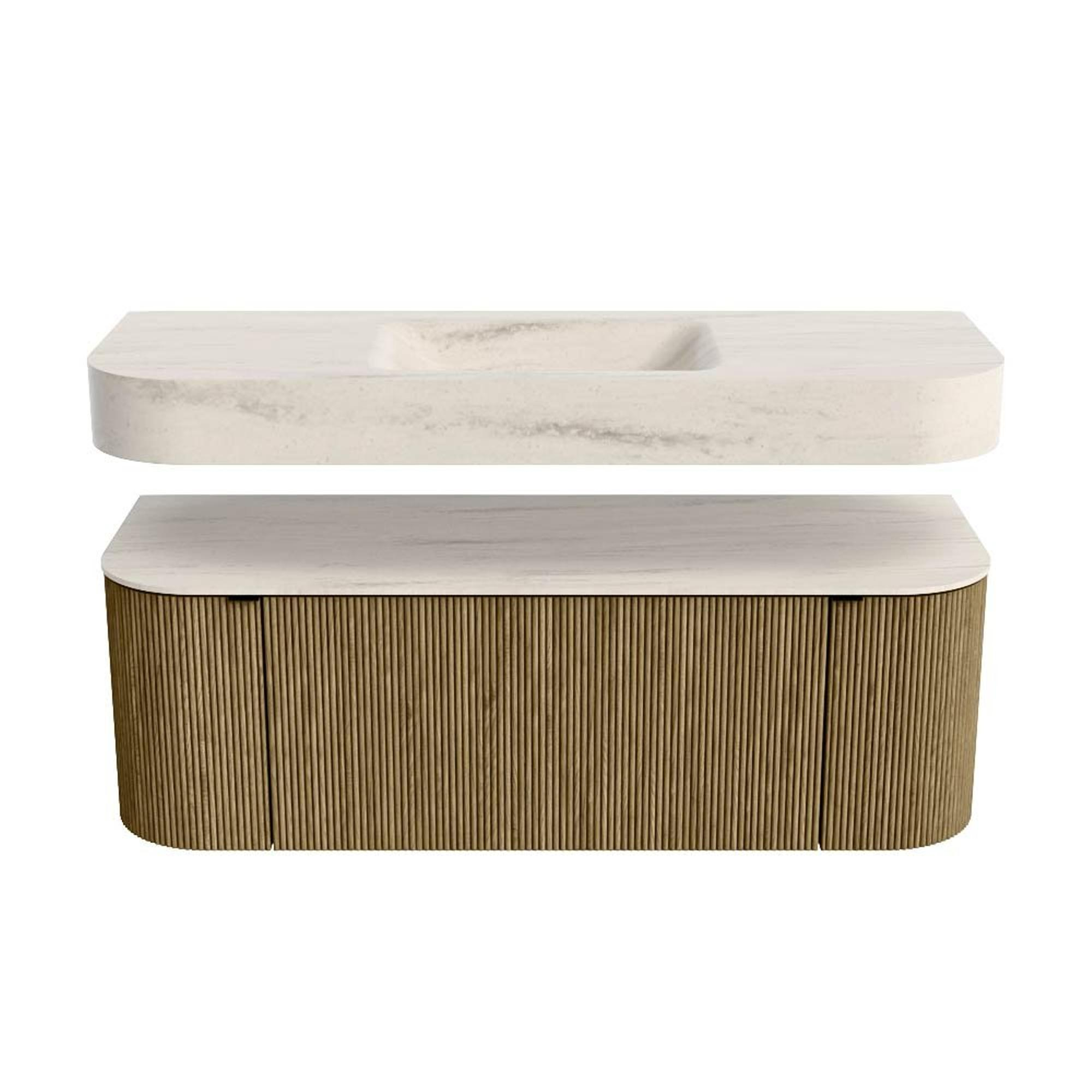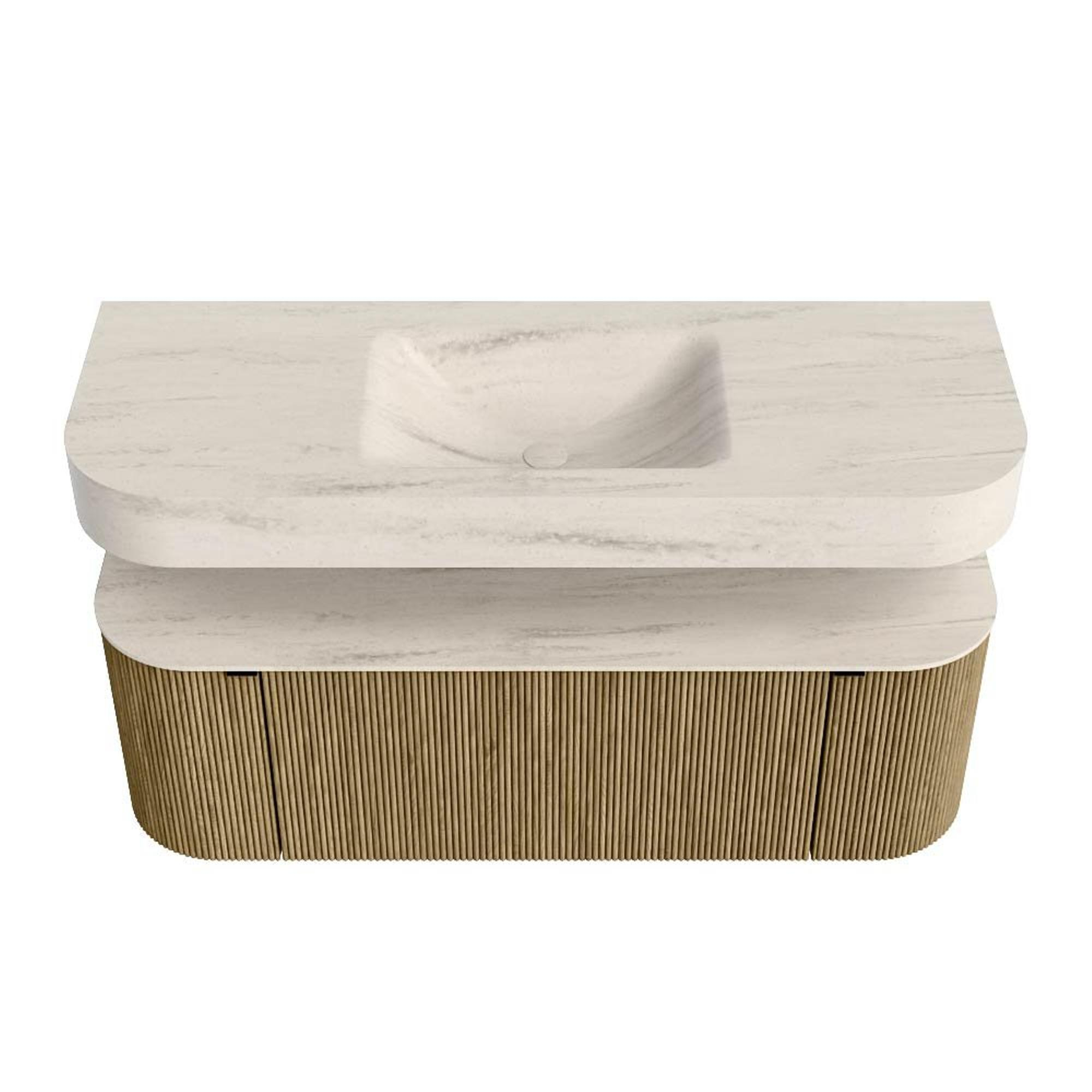Boven het meubel zweeft een bijpassende, vrij hangende wastafel met afgeronde hoeken – perfect afgestemd op de vorm van de kast. De wastafel is uitgevoerd in Solid Surface en volgt subtiel de lijnen van het onderliggende meubel, waardoor een harmonieus geheel ontstaat. Het Solid Surface topblad vormt een sterke, onderhoudsvriendelijke basis en maakt de combinatie compleet.