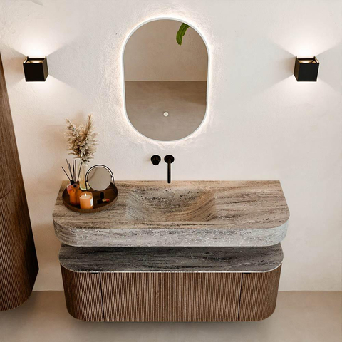 MONDIAZ THOR-DLUX 130cm badmeubel ronding links + rechts kleur Walnut met 1 lade en 2 deuren. Vrijhangende wastafel CLOUD Midden zonder kraangat kleur Oza.