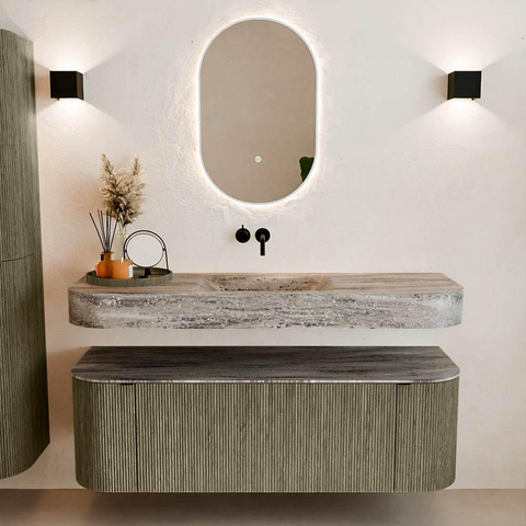 Natuurlijke materialen in warme tinten. De verticale ribbels brengen ritme en textuur in het ontwerp, terwijl het eikenhout zorgt voor een warme, ambachtelijke uitstraling. Kies uit 5 houttinten OAK, WALNUT, DUSK, SHADOW en RUBY zorgvuldig geselecteerde houtkleuren om zowel moderne als klassieke badkamers te verrijken.