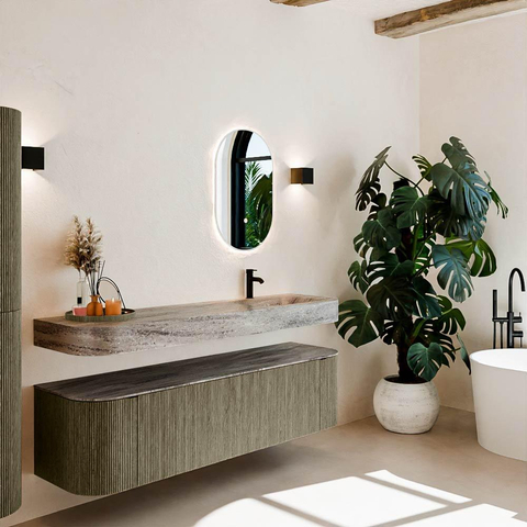 Natuurlijke materialen in warme tinten. De verticale ribbels brengen ritme en textuur in het ontwerp, terwijl het eikenhout zorgt voor een warme, ambachtelijke uitstraling. Kies uit 5 houttinten OAK, WALNUT, DUSK, SHADOW en RUBY zorgvuldig geselecteerde houtkleuren om zowel moderne als klassieke badkamers te verrijken.