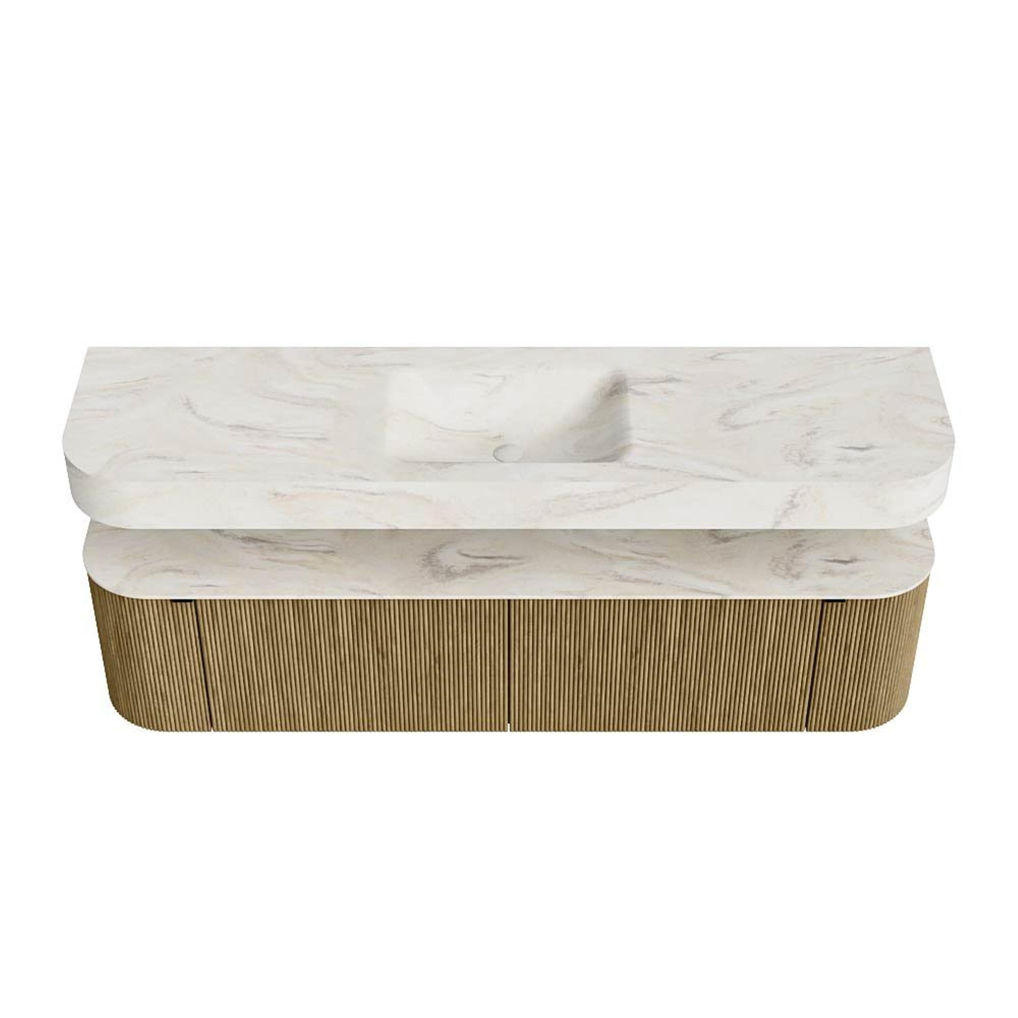 Boven het meubel zweeft een bijpassende, vrij hangende wastafel met afgeronde hoeken – perfect afgestemd op de vorm van de kast. De wastafel is uitgevoerd in Solid Surface en volgt subtiel de lijnen van het onderliggende meubel, waardoor een harmonieus geheel ontstaat. Het Solid Surface topblad vormt een sterke, onderhoudsvriendelijke basis en maakt de combinatie compleet.