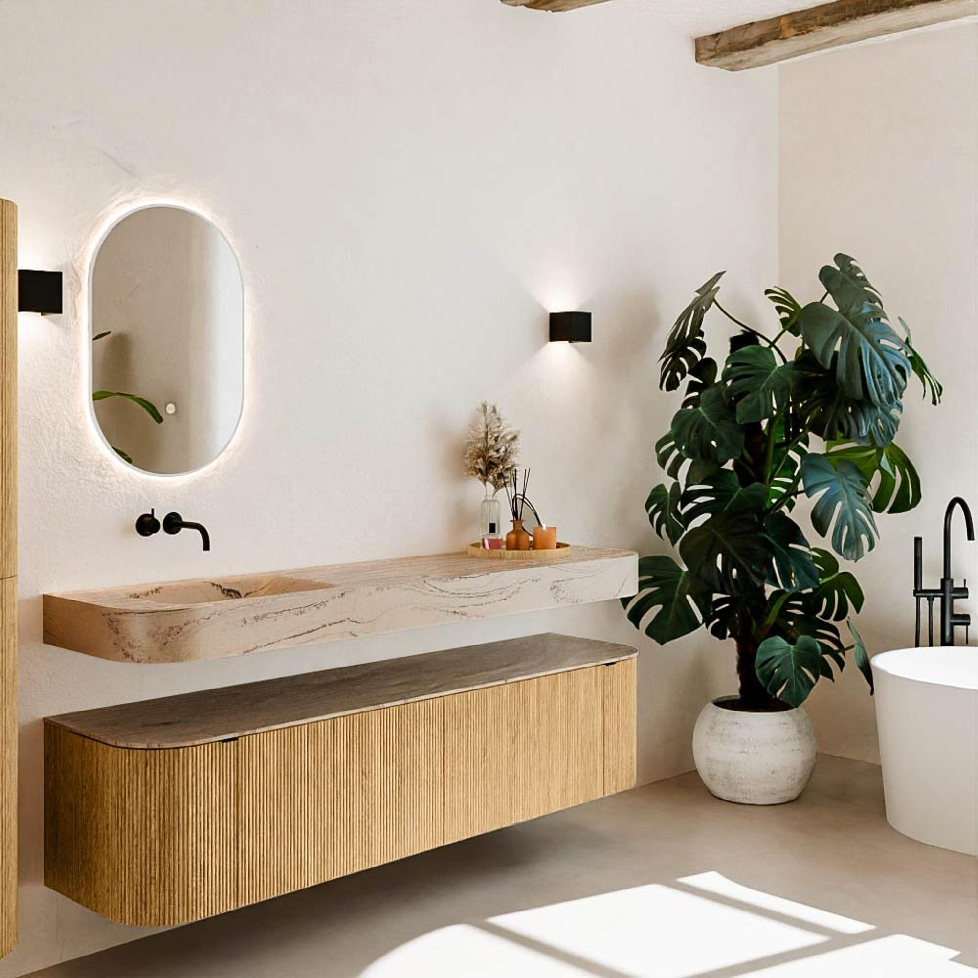 Natuurlijke materialen in warme tinten. De verticale ribbels brengen ritme en textuur in het ontwerp, terwijl het eikenhout zorgt voor een warme, ambachtelijke uitstraling. Kies uit 5 houttinten OAK, WALNUT, DUSK, SHADOW en RUBY zorgvuldig geselecteerde houtkleuren om zowel moderne als klassieke badkamers te verrijken.