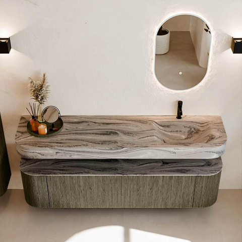 MONDIAZ THOR-DLUX 180cm badmeubel ronding links + rechts kleur Shadow met 2 lades en 2 deuren. Vrijhangende wastafel CLOUD Rechts 1 kraangat kleur Sombra.