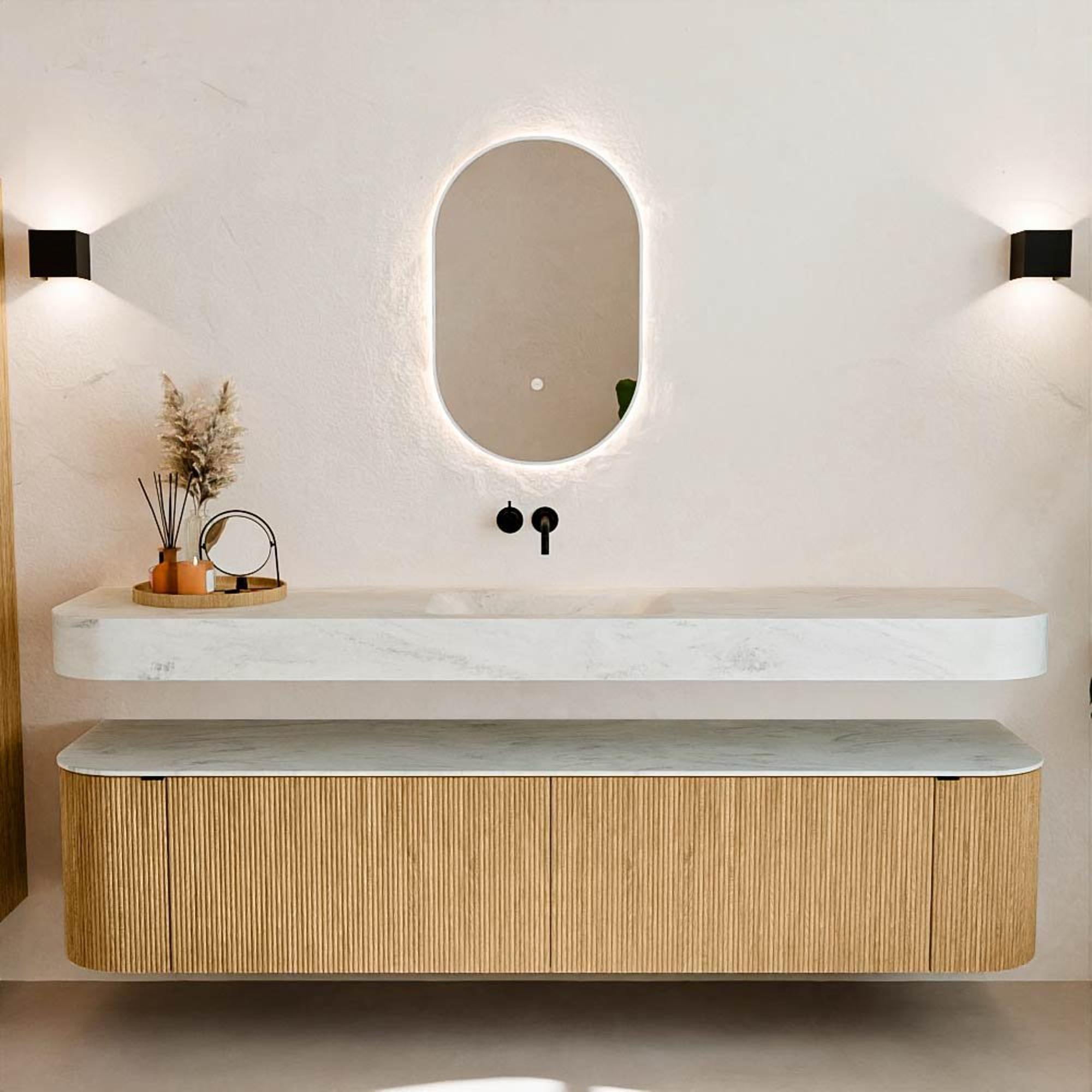 Natuurlijke materialen in warme tinten. De verticale ribbels brengen ritme en textuur in het ontwerp, terwijl het eikenhout zorgt voor een warme, ambachtelijke uitstraling. Kies uit 5 houttinten OAK, WALNUT, DUSK, SHADOW en RUBY zorgvuldig geselecteerde houtkleuren om zowel moderne als klassieke badkamers te verrijken.