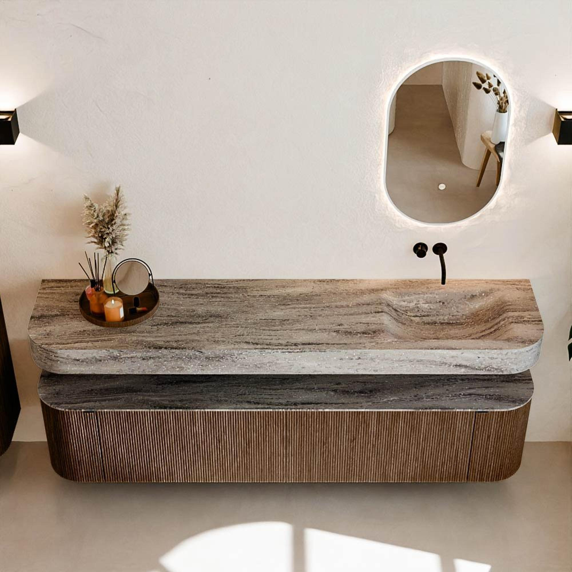 Natuurlijke materialen in warme tinten. De verticale ribbels brengen ritme en textuur in het ontwerp, terwijl het eikenhout zorgt voor een warme, ambachtelijke uitstraling. Kies uit 5 houttinten OAK, WALNUT, DUSK, SHADOW en RUBY zorgvuldig geselecteerde houtkleuren om zowel moderne als klassieke badkamers te verrijken.