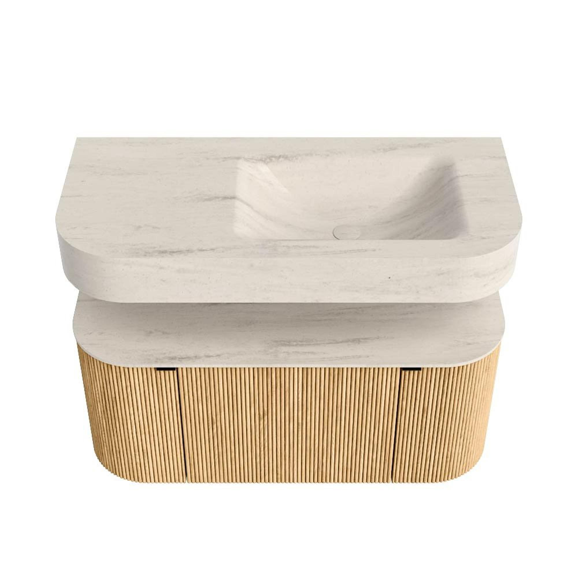 Boven het meubel zweeft een bijpassende, vrij hangende wastafel met afgeronde hoeken – perfect afgestemd op de vorm van de kast. De wastafel is uitgevoerd in Solid Surface en volgt subtiel de lijnen van het onderliggende meubel, waardoor een harmonieus geheel ontstaat. Het Solid Surface topblad vormt een sterke, onderhoudsvriendelijke basis en maakt de combinatie compleet.