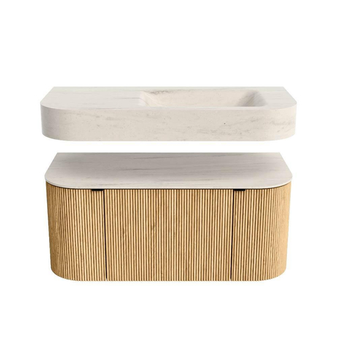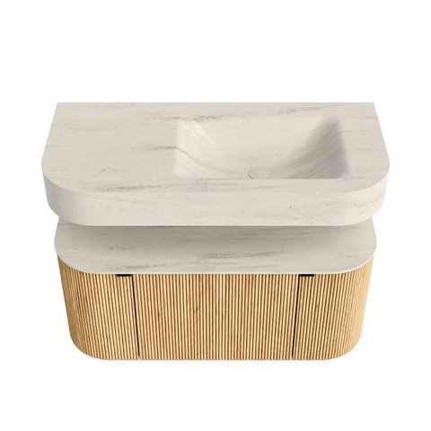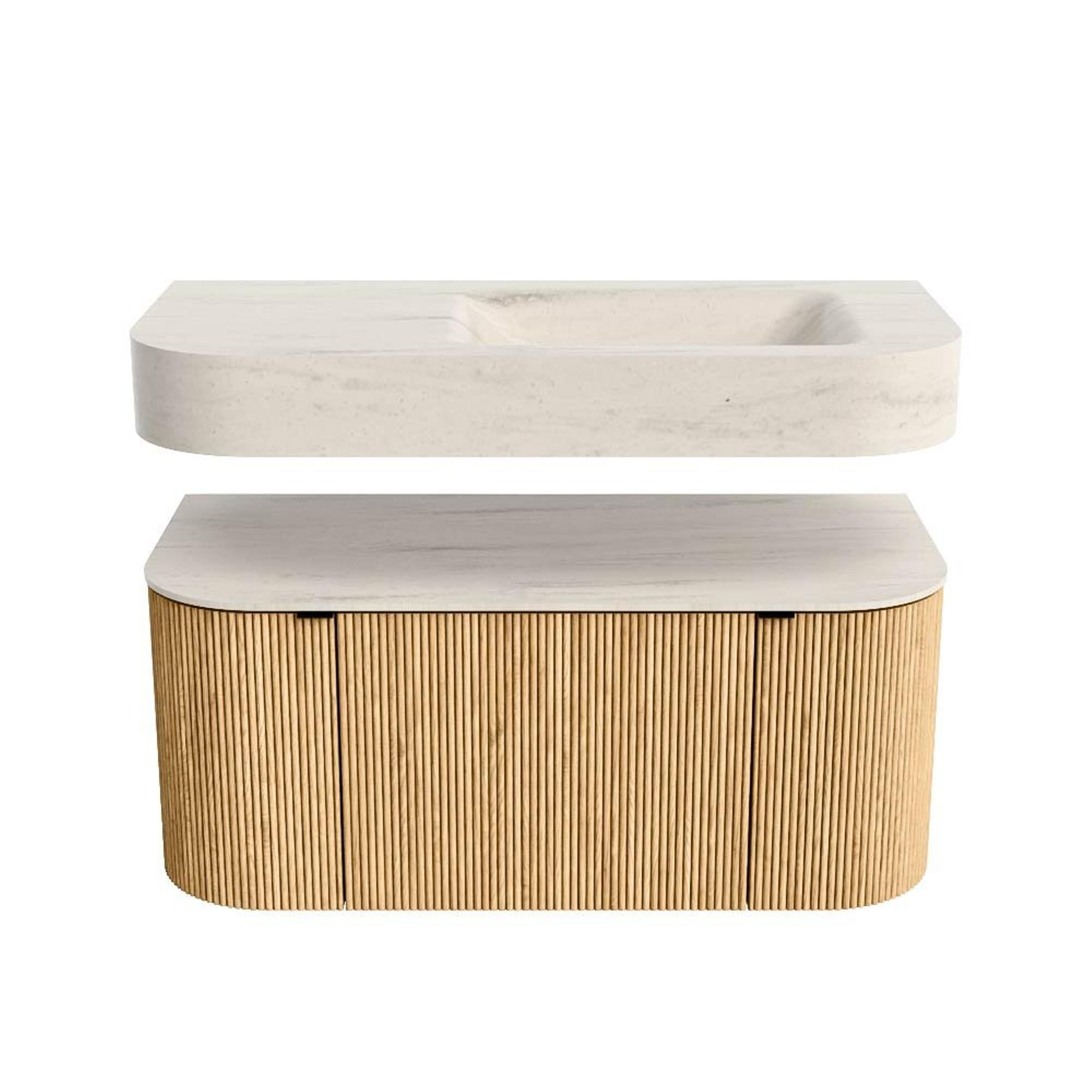 MONDIAZ THOR-DLUX 100cm badmeubel ronding links + rechts kleur Oak met 1 lade en 2 deuren. Vrijhangende wastafel CLOUD Rechts zonder kraangat kleur Meli.