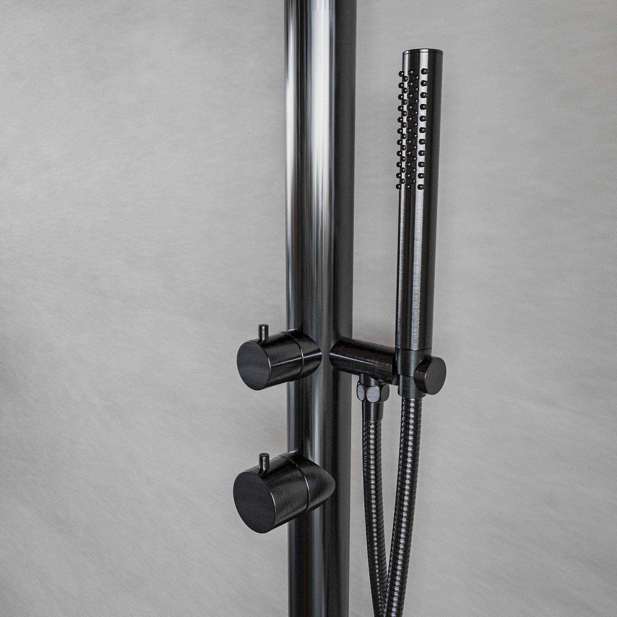 De FugaFlow Eccelente Acces Deluxe Vrijstaande Buitendouche in geborsteld Gunmetal PVD is een stijlvolle en duurzame toevoeging aan jouw buitenruimte. Deze buitendouche is gemaakt van hoogwaardig RVS 316 en biedt zowel een regendouche als een handdouche voor een luxe en comfortabele douche-ervaring in de buitenlucht.