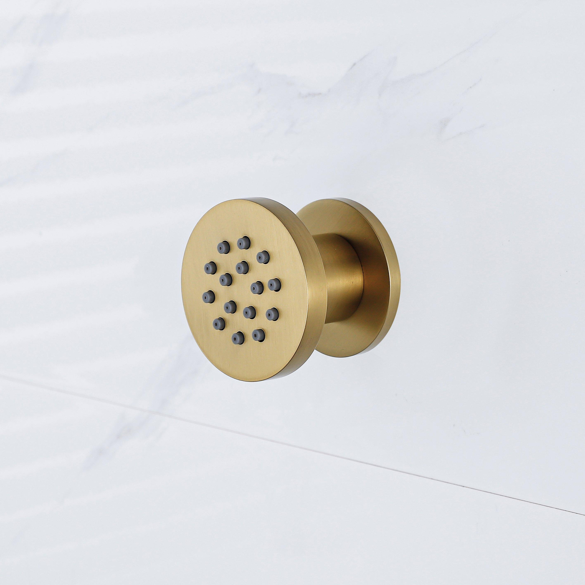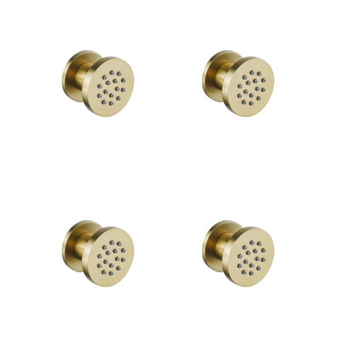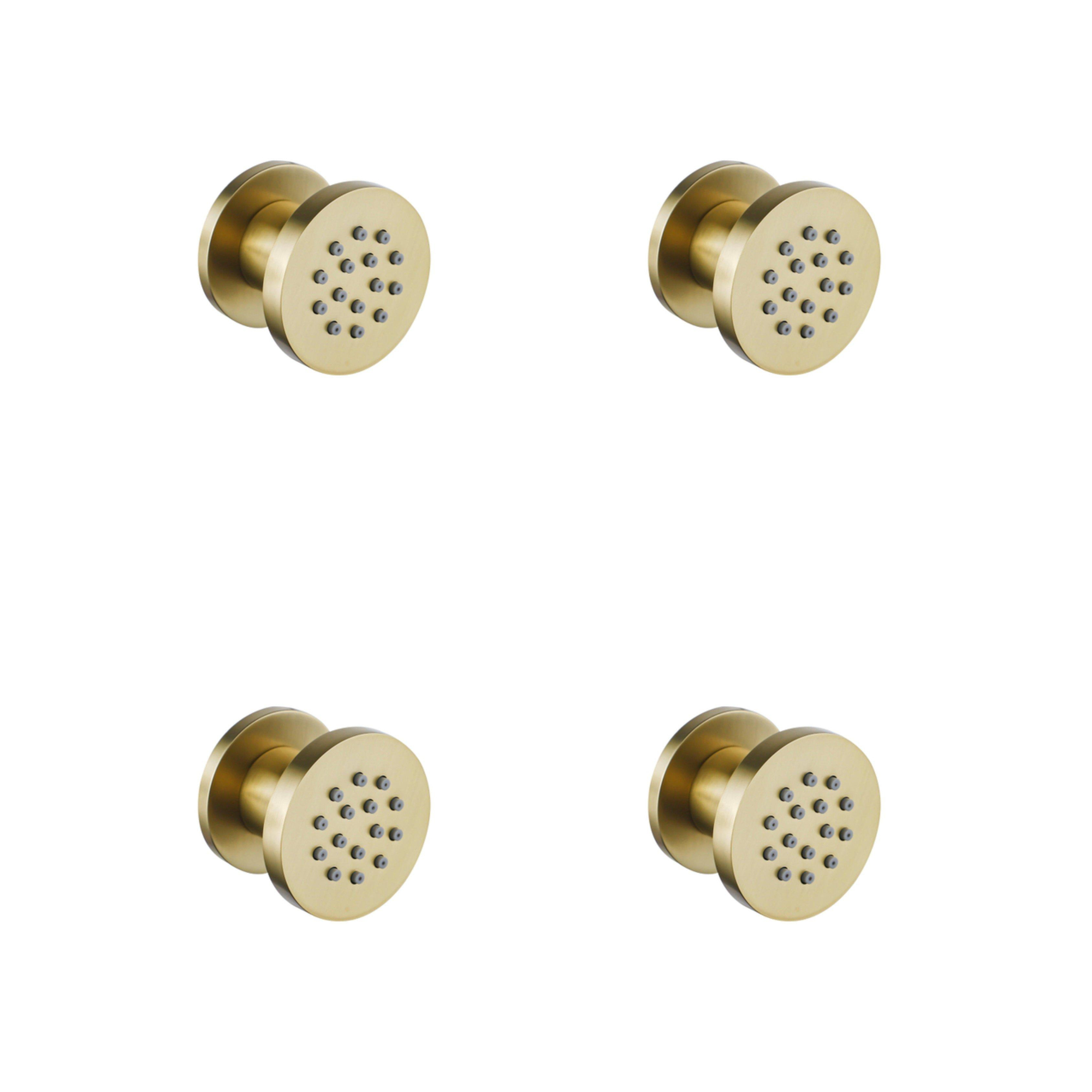 De FugaFlow Eccelente Acces zijdouche in geborsteld messing met een warme gouden PVD-coating is een stijlvolle en duurzame toevoeging aan jouw badkamer. Met een compacte diameter van 5 cm en een ronde vorm geeft deze set van 4 zijdouches jouw douche een luxe uitstraling en een verfrissende waterstraal voor een ontspannen ervaring.