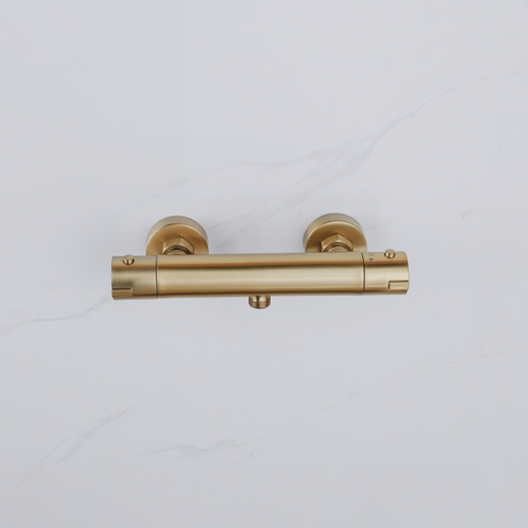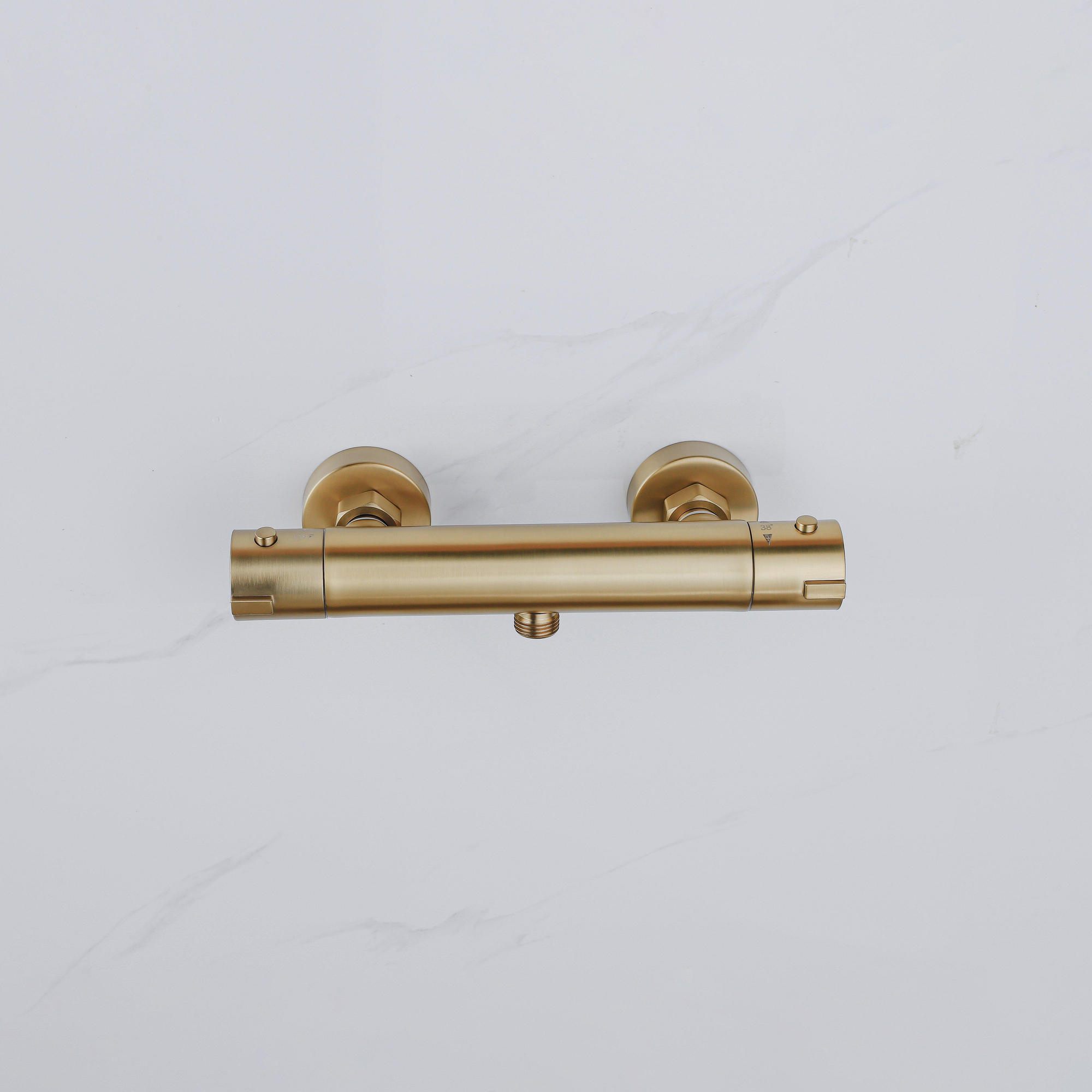 Stap in de wereld van luxe en comfort met de FugaFlow Efficiente Sobrado thermostatische douchekraan in een stijlvolle goud matte afwerking. Deze opbouwkraan zorgt voor een constante en veilige watertemperatuur, zodat je elke douchebeurt optimaal kunt ontspannen en genieten. Het moderne en elegante design geeft jouw badkamer een verfijnde uitstraling.