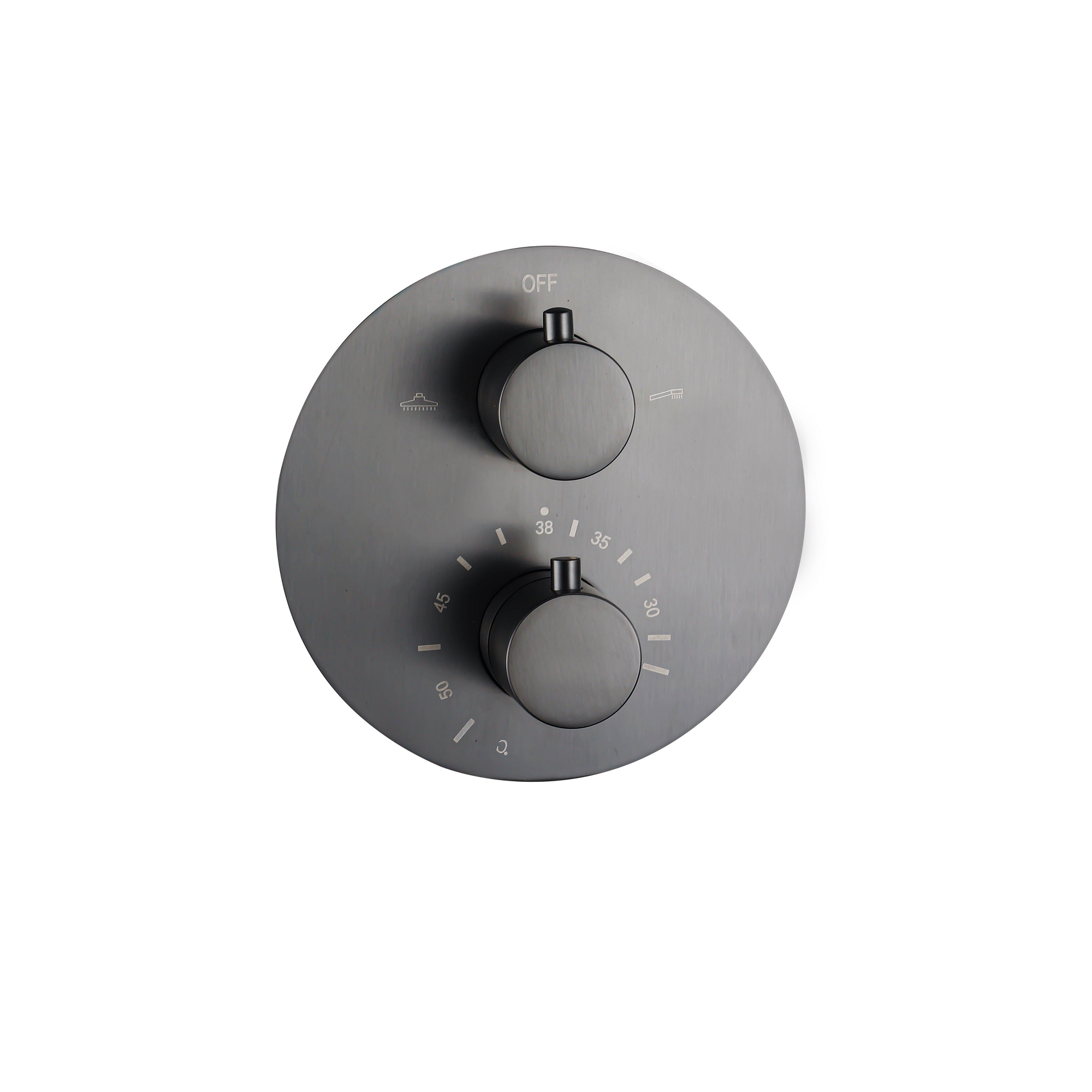 De FugaFlow Eccelente Acces Thermostatische Inbouwkraan in Gunmetal is een stijlvolle en moderne toevoeging aan je badkamer. Dankzij het ronde ontwerp en de geborstelde gunmetal afwerking geeft deze inbouwkraan jouw badkamer een luxe en eigentijdse uitstraling. Met de ingebouwde thermostaat geniet je altijd van een comfortabele en veilige watertemperatuur tijdens het douchen.