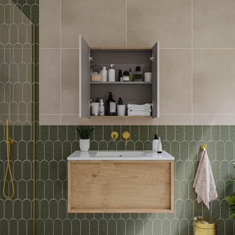 De natuurlijke eiken finish geeft deze spiegelkast een authentieke en warme uitstraling die moeiteloos combineert met verschillende badkamerstijlen. Of je nu kiest voor strak modern, gezellig landelijk of klassiek, dit meubelstuk voegt altijd karakter toe. Het massief hout zorgt voor een luxe gevoel en een hoogwaardige uitstraling, waardoor je badkamer direct een upgrade krijgt. De subtiele details en het strakke design zorgen voor een harmonieus geheel waarin functionaliteit en esthetiek samenkomen. Zo geniet je niet alleen van een praktisch meubel, maar ook van een stijlvol pronkstuk dat jouw persoonlijke smaak weerspiegelt.