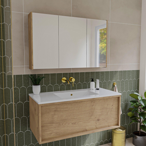 Deze spiegelkast is een toonbeeld van tijdloze elegantie dankzij het gebruik van natuurlijk eikenhout. Het warme, lichte hout met een natuurlijke afwerking voegt direct karakter toe aan je badkamer. De strakke lijnen en het minimalistische design zorgen ervoor dat de kast moeiteloos aansluit bij diverse interieurstijlen, van modern tot landelijk. Door de drie draaideuren met spiegel creëer je een functioneel meubel dat ook visueel ruimte vergroot. Zo combineer je moeiteloos stijl en gebruiksgemak in één meubelstuk, wat jouw badkamer een rustige en uitnodigende uitstraling geeft.