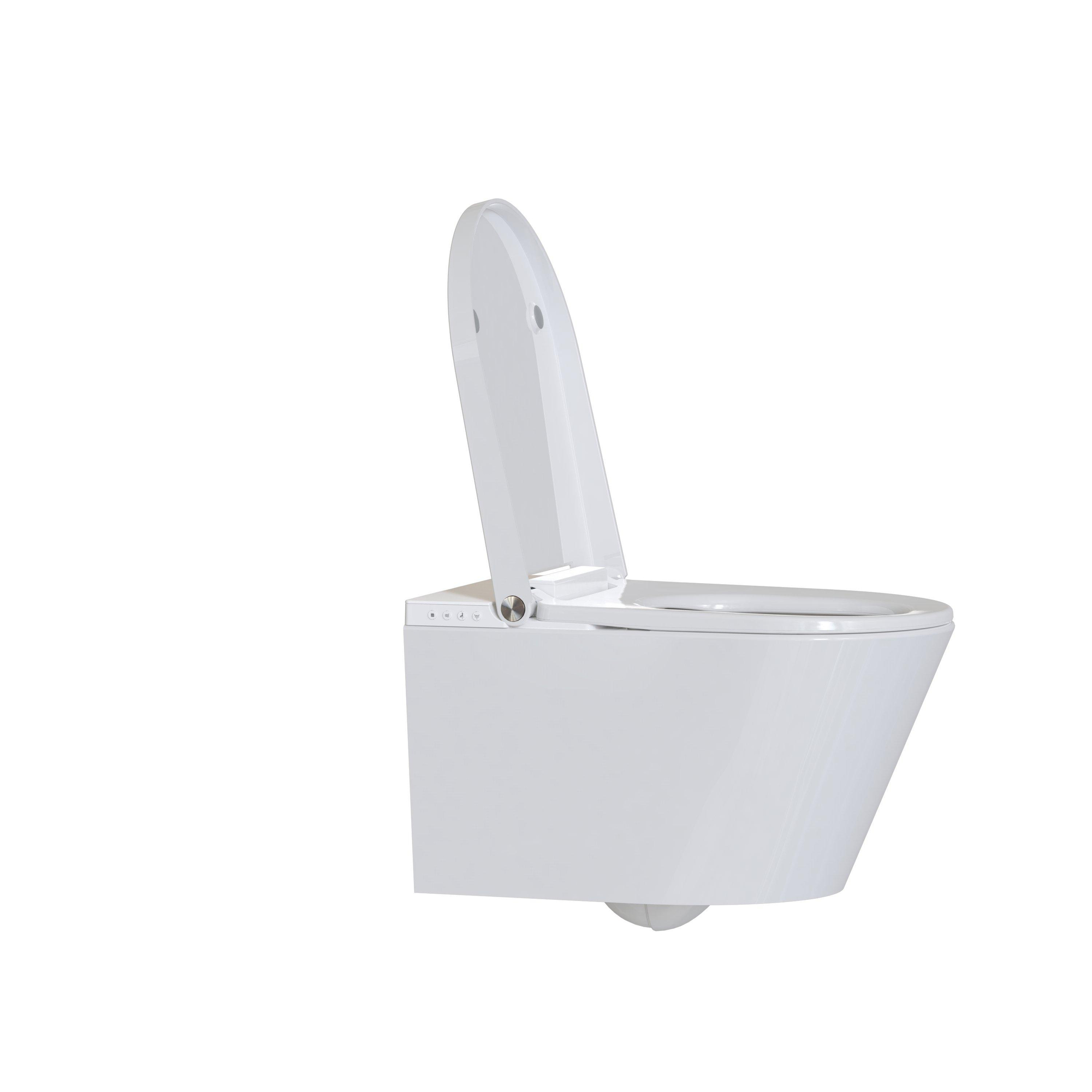 - Glans wit keramiek met randloos design voor een hygiënische, moderne uitstraling en makkelijker schoonmaken.