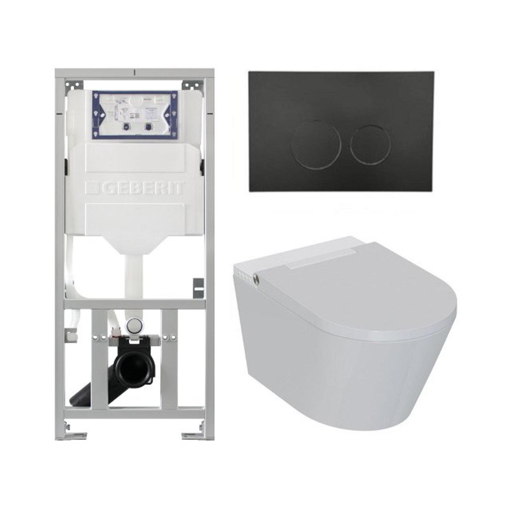 QeramiQ Luma Douche WC Set - Geberit UP320 inbouwreservoir - met Burda frame - fohn - ladydouche - mat zwarte kunststof bedieningsplaat - ronde knoppen - glans wit