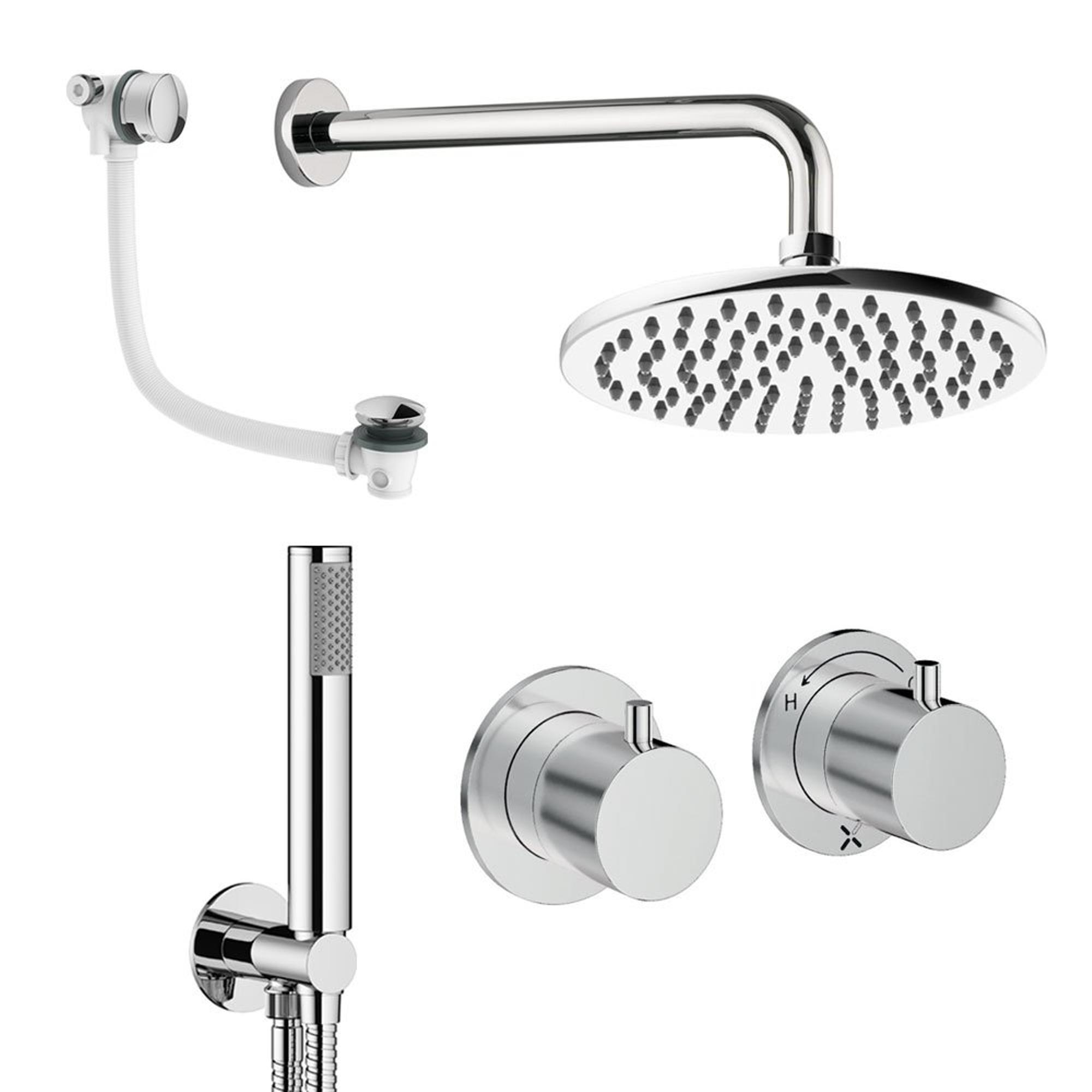 - Complete inbouw regendoucheset met hoofddouche, handdouche en badafvoer voor een uniforme look in bad en douche.