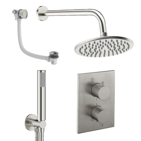 De geborsteld RVS kleur geeft je douchehoek direct een hoogwaardige en tijdloze uitstraling. De subtiele glans en fijne structuur ogen minder gevoelig voor vingerafdrukken en watervlekken dan hoogglans chroom, waardoor je badkamer langer verzorgd oogt. De ronde hoofddouche in combinatie met de slanke staafhanddouche en strakke bedieningsplaat zorgt voor een rustige, evenwichtige vormtaal. Dit maakt de set heel geschikt als basis voor een harmonische stijl in de hele badkamer, bijvoorbeeld in combinatie met RVS accenten op kranen, accessoires en doucheprofielen. Door te kiezen voor één consistente afwerking creëer je een professionele, doordachte look zoals je die kent uit luxe hotels en designshowrooms.