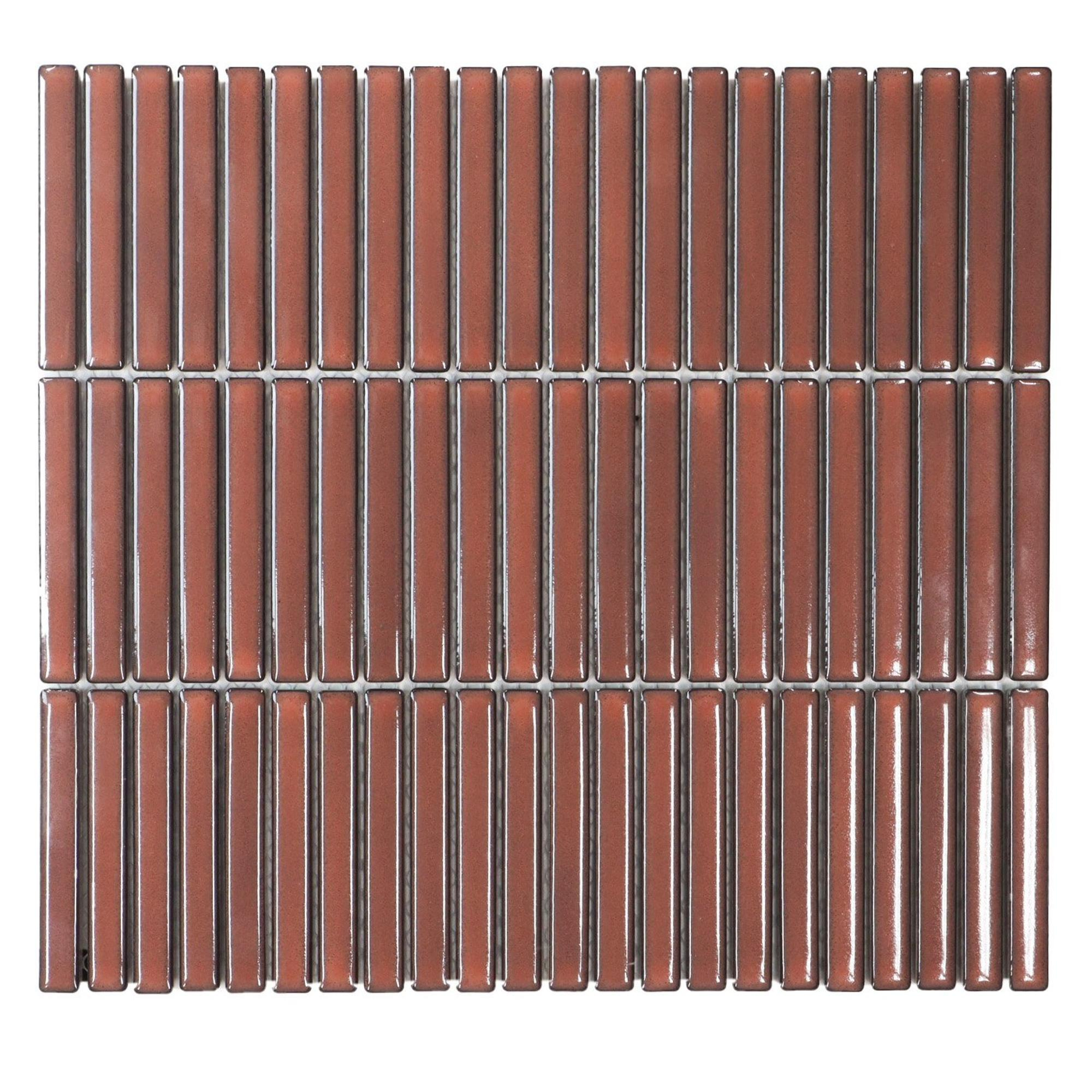 Zoek je een opvallende blikvanger voor je badkamer, toilet, keuken of bijvoorbeeld een nis in de woonkamer, dan is deze verfijnde mozaïektegel een hele sterke kandidaat. De langgerekte, smalle steentjes zorgen voor een speels KitKat-effect op de wand, terwijl de warme smoked-cherry tint direct sfeer en karakter toevoegt. Door de glanzende afwerking oogt het geheel luxe en levendig; perfect als je een hotel-chique uitstraling wilt creëren of een bijzonder accent wilt leggen achter het wastafelmeubel, bij het bad of achter het fornuis. Dankzij het praktische matformaat laat de tegel zich goed verwerken, ook in kleinere ruimtes of rond hoeken en details. Zo combineer je opvallend design met slim gebruiksgemak, zowel in nieuwbouwprojecten als bij het renoveren van een bestaande badkamer of toilet.