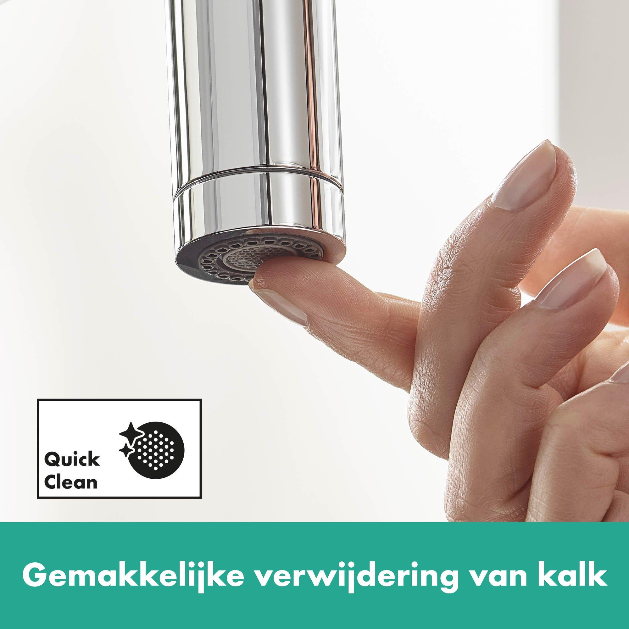 Deze kraan is gebouwd om lang mee te gaan. Het hoogwaardige keramische binnenwerk zorgt voor een soepele bediening en voorkomt lekkages, zelfs na jarenlang intensief gebruik. De chroomafwerking is niet alleen mooi, maar ook bestand tegen krassen en kalkaanslag, waardoor je kraan er altijd als nieuw uitziet. Dankzij de QuickClean siliconennoppen verwijder je kalk eenvoudig met een zachte veeg, zonder agressieve schoonmaakmiddelen. Bovendien zijn de flexibele aansluitslangen gecertificeerd voor drinkwater, wat garant staat voor veiligheid en betrouwbaarheid in jouw keuken.
