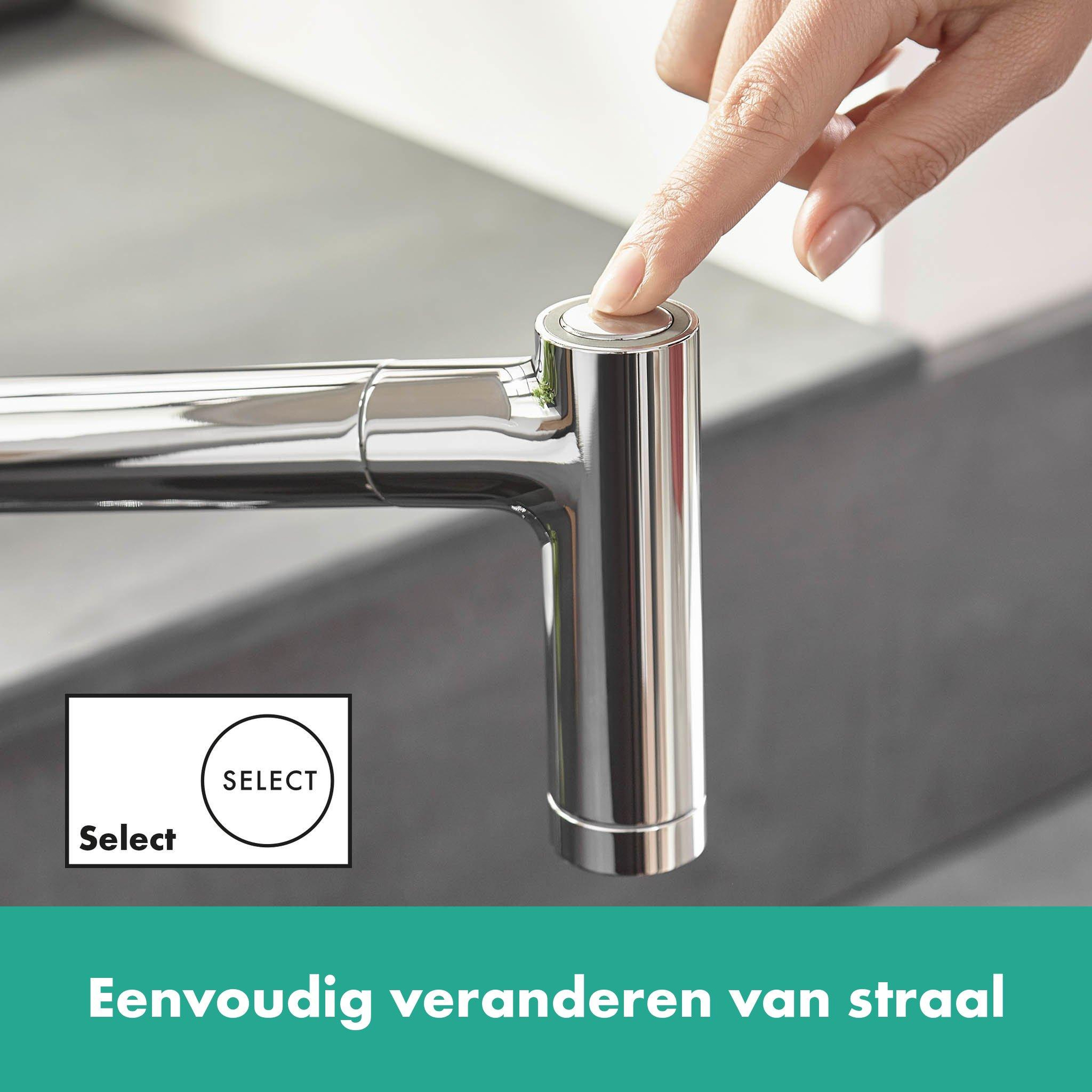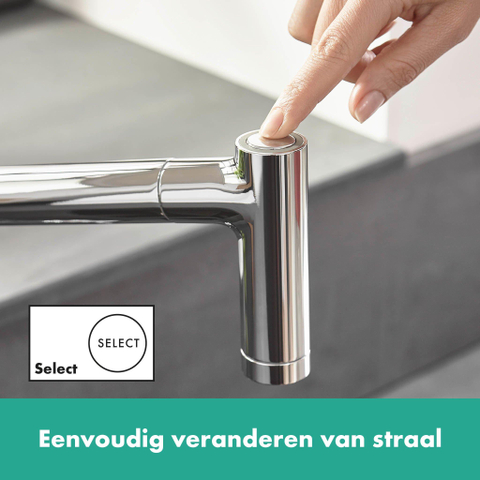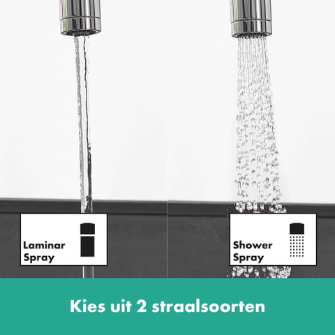 - Keuze uit laminaire straal en douchestraal, eenvoudig te wisselen met Select-knop