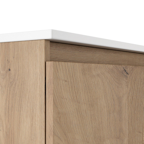 - Rustiek eiken houtlook zorgt voor een warme, natuurlijke uitstraling in combinatie met een frisse witte wasbak.