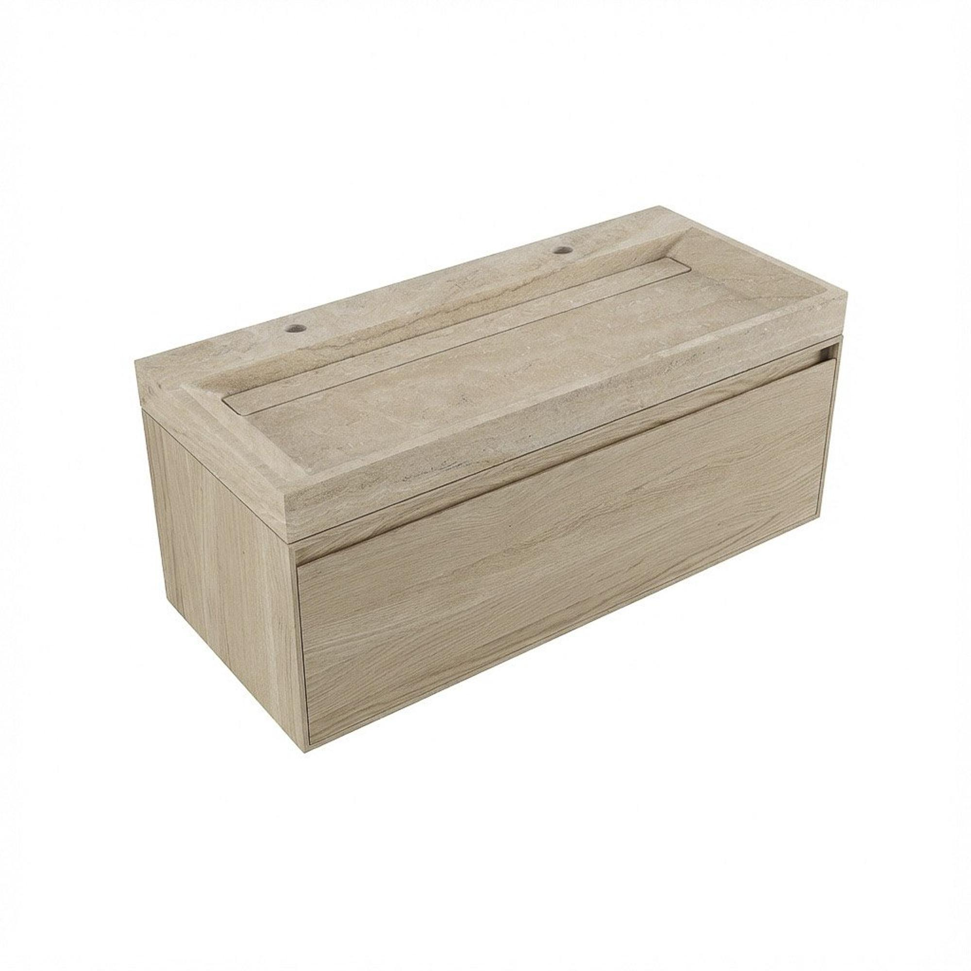 Met deze complete, vrijhangende badkamermeubelset creëer je in één keer een luxe, serene blikvanger in je badkamer. Het royale meubel van 100 cm is ideaal voor de hoofd- of designbadkamer waarin je zowel uitstraling als dagelijks comfort belangrijk vindt. De combinatie van licht beige travertin en massief eiken in de kleur Smoke past perfect bij interieurs met natuurlijke materialen, warme aardetinten en een rustige, mediterrane sfeer. Dankzij het strakke, zwevende ontwerp oogt de ruimte groter en opgeruimder, terwijl de praktische lade je helpt om alledaagse spullen netjes uit het zicht op te bergen. Deze set is bijzonder geschikt als je bewust kiest voor duurzame materialen, een tijdloos ontwerp en hoogwaardige afwerking die jarenlang mooi blijft.