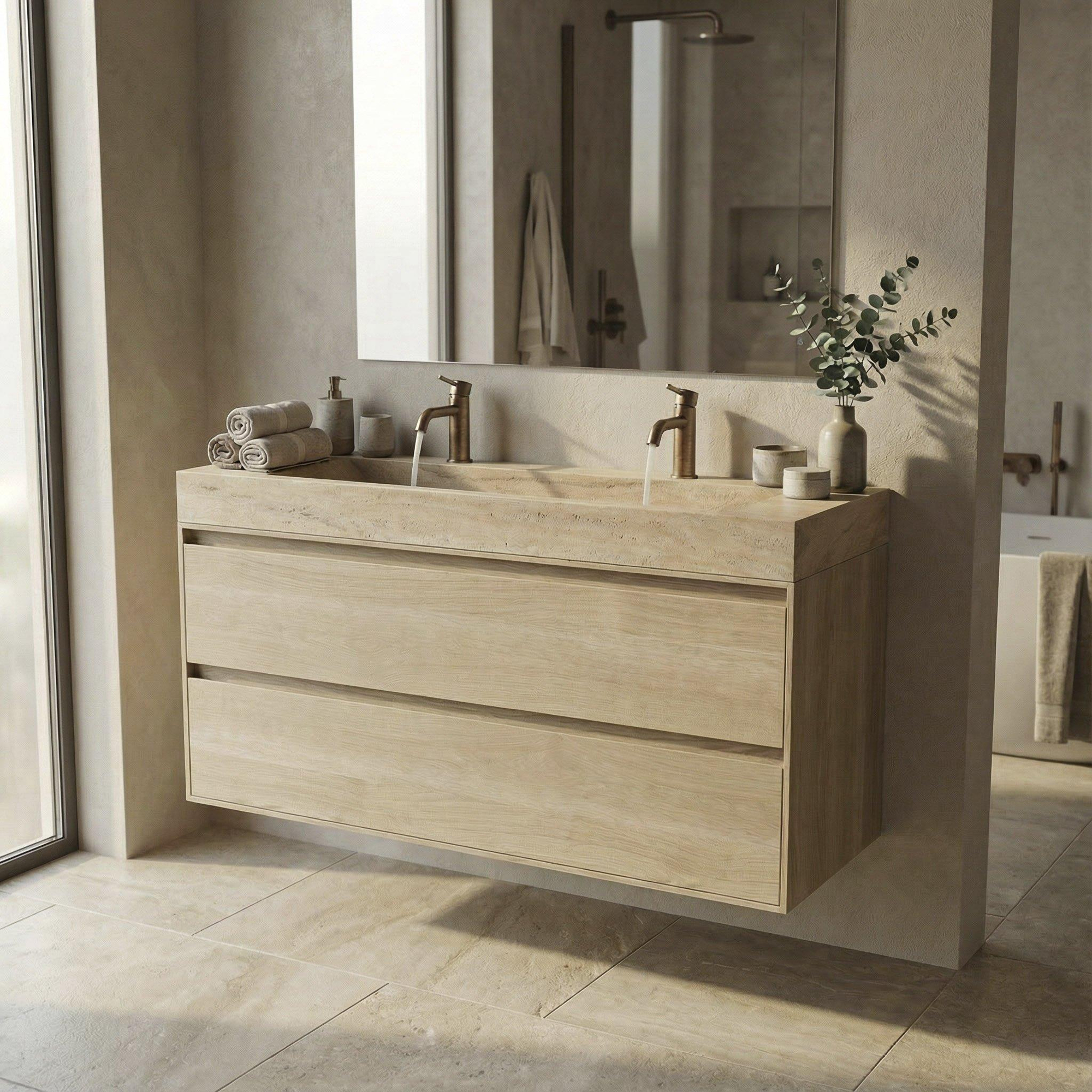 Deze complete badkamermeubelset is perfect als je op zoek bent naar een luxe, natuurlijke uitstraling met een hoogwaardige afwerking. Het lichte travertin in combinatie met het massieve eikenhout in de kleur Smoke past prachtig in moderne, hotel-chique en mediterrane badkamers, maar ook in rustige Scandinavische interieurs. Door het vrijhangende ontwerp oogt de ruimte ruimtelijker en blijft de vloer vrij, wat ideaal is in zowel compacte stadsbadkamers als royale master badrooms. Dankzij de twee lades heb je veel opbergruimte voor al je dagelijkse badkamerbenodigdheden, terwijl de dubbele kraangaten het makkelijk maken om met twee personen tegelijk de wastafel te gebruiken. Kies je bewust voor kwaliteit, natuurlijke materialen en een tijdloos ontwerp, dan sluit deze set naadloos aan op jouw wensen.