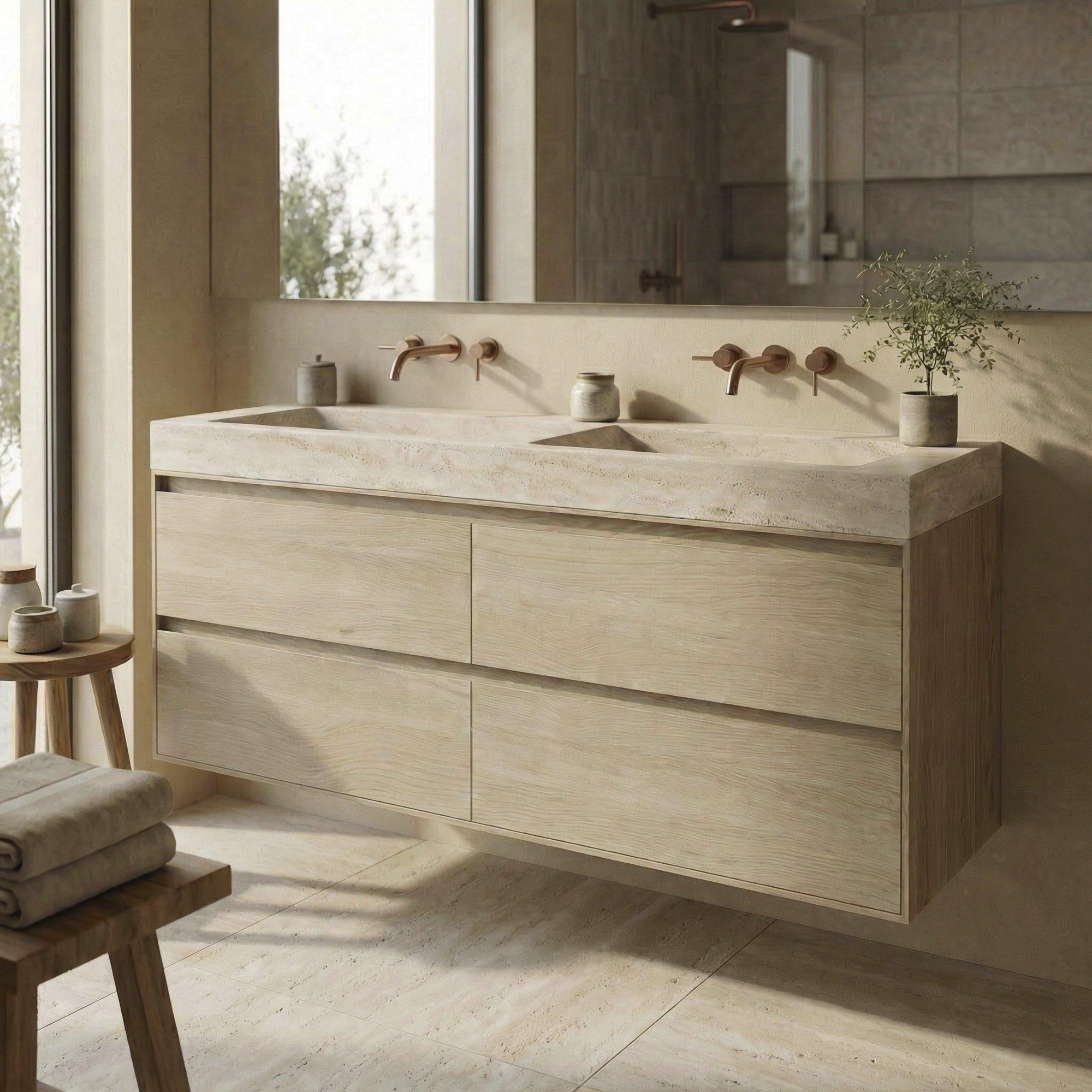 Met deze hoogwaardige badkamermeubelset haal je een echte blikvanger in huis die perfect past in stijlvolle, moderne badkamers waar rust en natuurlijke materialen centraal staan. De combinatie van massief travertin in licht beige en een massief eiken onderkast in de kleur Smoke zorgt voor een warme, mediterrane sfeer die prachtig tot zijn recht komt in zowel een luxe gezinsbadkamer als een designgerichte en suite. Dankzij de royale breedte van 160 cm en de vier praktische lades is er volop opbergruimte, terwijl het vrijhangende ontwerp de vloer vrij laat en je badkamer optisch groter doet lijken. Zoek je een duurzame, tijdloze oplossing waarin kwaliteit, materiaalbeleving en dagelijks gebruiksgemak samenkomen, dan biedt deze complete set een zeer doordachte basis voor jouw droombadkamer.