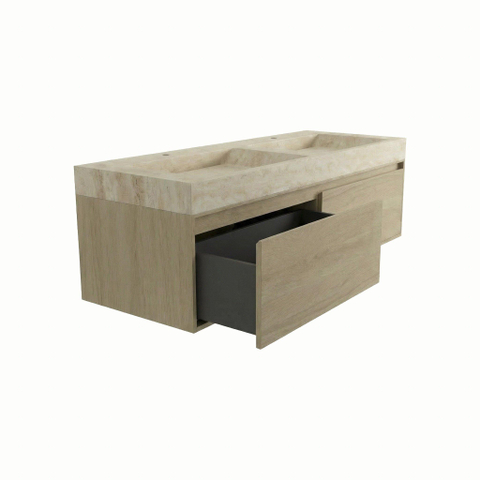 - Complete set met travertin wastafel, vrijhangend meubel, steunenset en chroomkleurige afvoerplug.