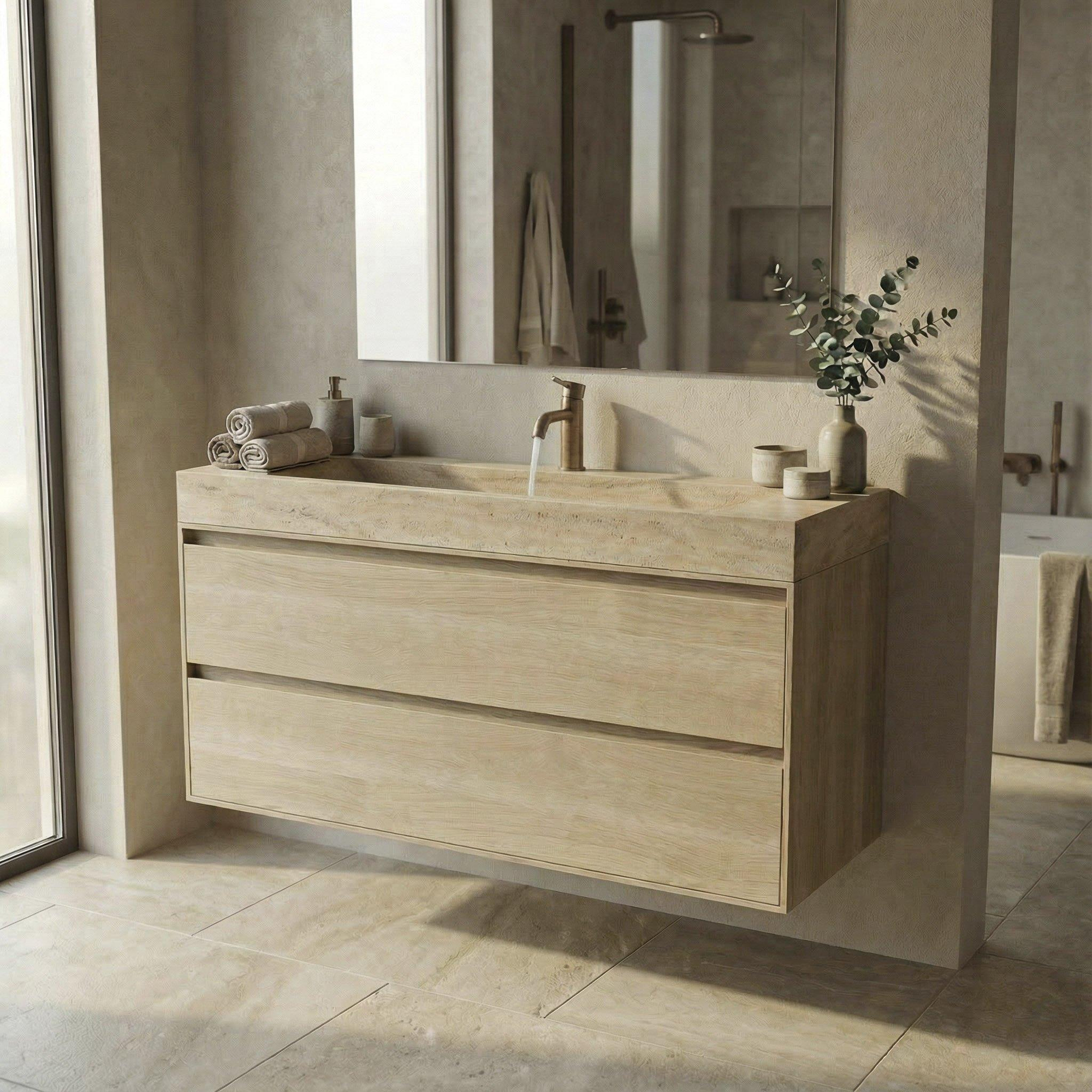 Met deze hoogwaardige badkamermeubelset haal je een uitgesproken luxueuze blikvanger in huis, ideaal voor wie een serene, natuurlijke sfeer wil creëren in de badkamer. De combinatie van licht beige natuursteen en een massief eiken onderkast in de kleur Smoke sluit perfect aan bij moderne interieurtrends waarin warmte, rust en tactiliteit centraal staan. Dankzij het royale formaat van 120 cm en de twee ruime lades is deze set bijzonder geschikt voor middelgrote tot grote badkamers, gezinsbadkamers en stijlvolle designrenovaties. Het vrijhangende ontwerp zorgt voor een luchtig en ruimtelijk effect, terwijl de geïntegreerde enkele wastafel met kraangat praktisch is voor dagelijks gebruik. Zoek je een tijdloos meubel dat niet alleen mooi oogt, maar ook gebouwd is voor jarenlang intensief gebruik, dan is deze complete set een zeer doordachte keuze.