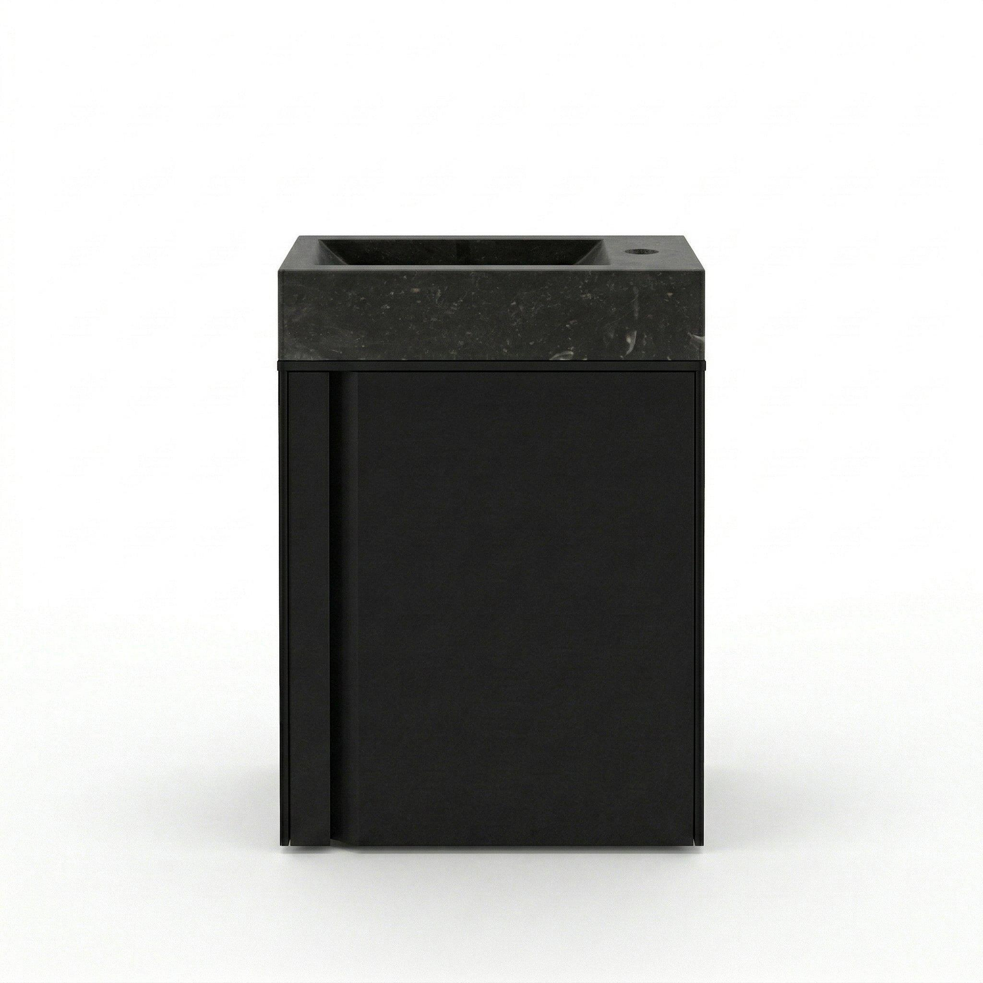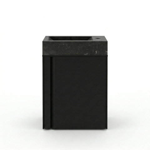 Deze toiletmeubelset met fontein in donker natuursteen en compact fonteinmeubel biedt een praktische oplossing voor toiletruimtes en kleine badkamers. De wasbak is voorzien van 1 kraangat rechts, zodat je eenvoudig een passende fonteinkraan kunt combineren met andere kranen en badkameraccessoires. Het wandhangende meubel met 1 deur en rechts scharnierende montagezijde zorgt voor extra opbergruimte voor toiletartikelen, terwijl de softclose-deur het sanitair beschermt en het comfort verhoogt. Dankzij de rechtlijnige vorm en het vlakke front sluit deze set mooi aan op strakke tegelwerk-afwerkingen en moderne badkamerinrichting.