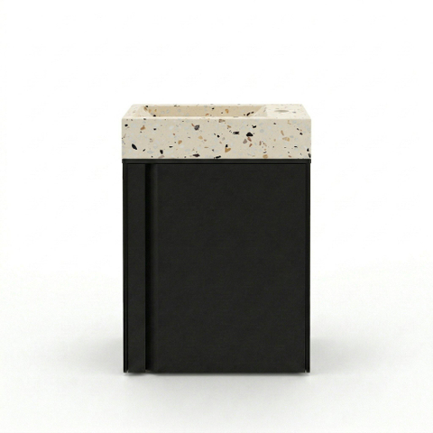 Het strakke design van deze toiletmeubelset sluit naadloos aan bij hedendaagse badkamermeubels en sanitair in mat zwarte uitvoering. De combinatie van een zwart mat fonteinkastje met een terrazzo fontein geeft een luxe, eigentijdse uitstraling die goed past bij een industriële, moderne of Scandinavische toiletruimte. De vlakke front zonder greep zorgt voor een minimalistische look, terwijl de rechte vorm van het meubel mooi aansluit op andere rechte lijnen in je badkamerinrichting. Zo wordt je fontein niet alleen een praktisch element, maar ook een stijlvol accent in je badkamer of toilet.