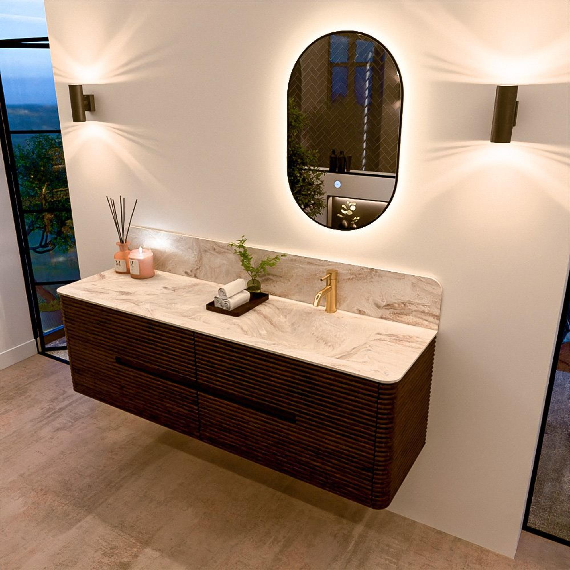 De wastafels van de CIRO-lijn worden vervaardigd uit hoogwaardig Solid Surface, een materiaal dat bekendstaat om zijn strakke uitstraling, hygiënische eigenschappen en uitstekende duurzaamheid. De wastafels zijn beschikbaar in 11 marmer- en travertin tinten, waarmee je het luxueuze karakter van natuursteen combineert met de voordelen van Solid Surface. De organische vorm van de kom versterkt het serene, sculpturale karakter van het ontwerp.