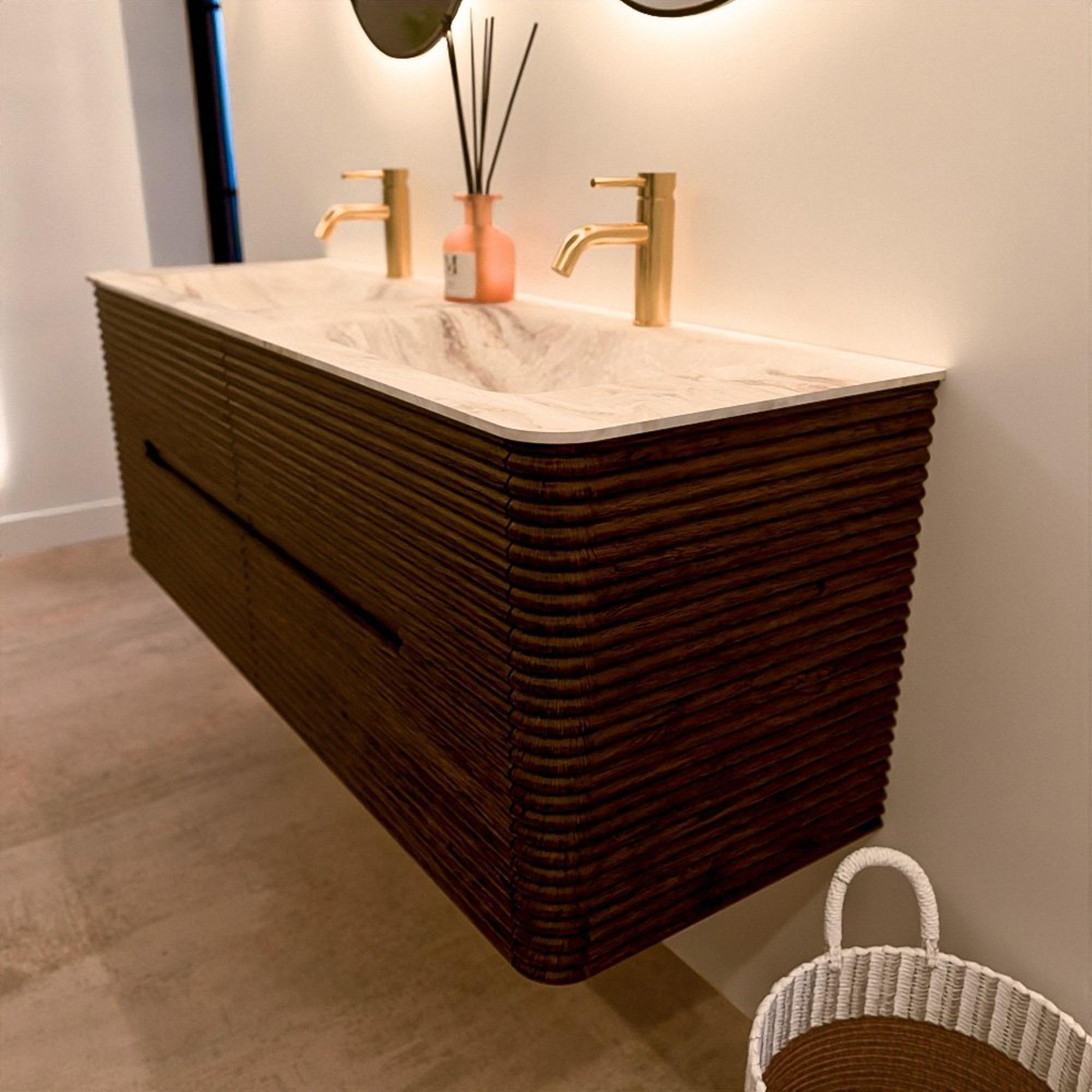 Mondiaz CIRO-DLUX Badkamermeubelset - 140x45x50cm - Solid surface wastafel Frappe - 2 wasbak Dubbel - 2 kraangaten - 4 lades - Walnut