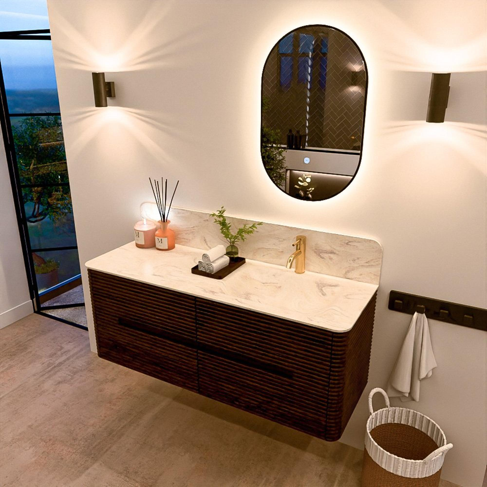 De wastafels van de CIRO-lijn worden vervaardigd uit hoogwaardig Solid Surface, een materiaal dat bekendstaat om zijn strakke uitstraling, hygiënische eigenschappen en uitstekende duurzaamheid. De wastafels zijn beschikbaar in 11 marmer- en travertin tinten, waarmee je het luxueuze karakter van natuursteen combineert met de voordelen van Solid Surface. De organische vorm van de kom versterkt het serene, sculpturale karakter van het ontwerp.