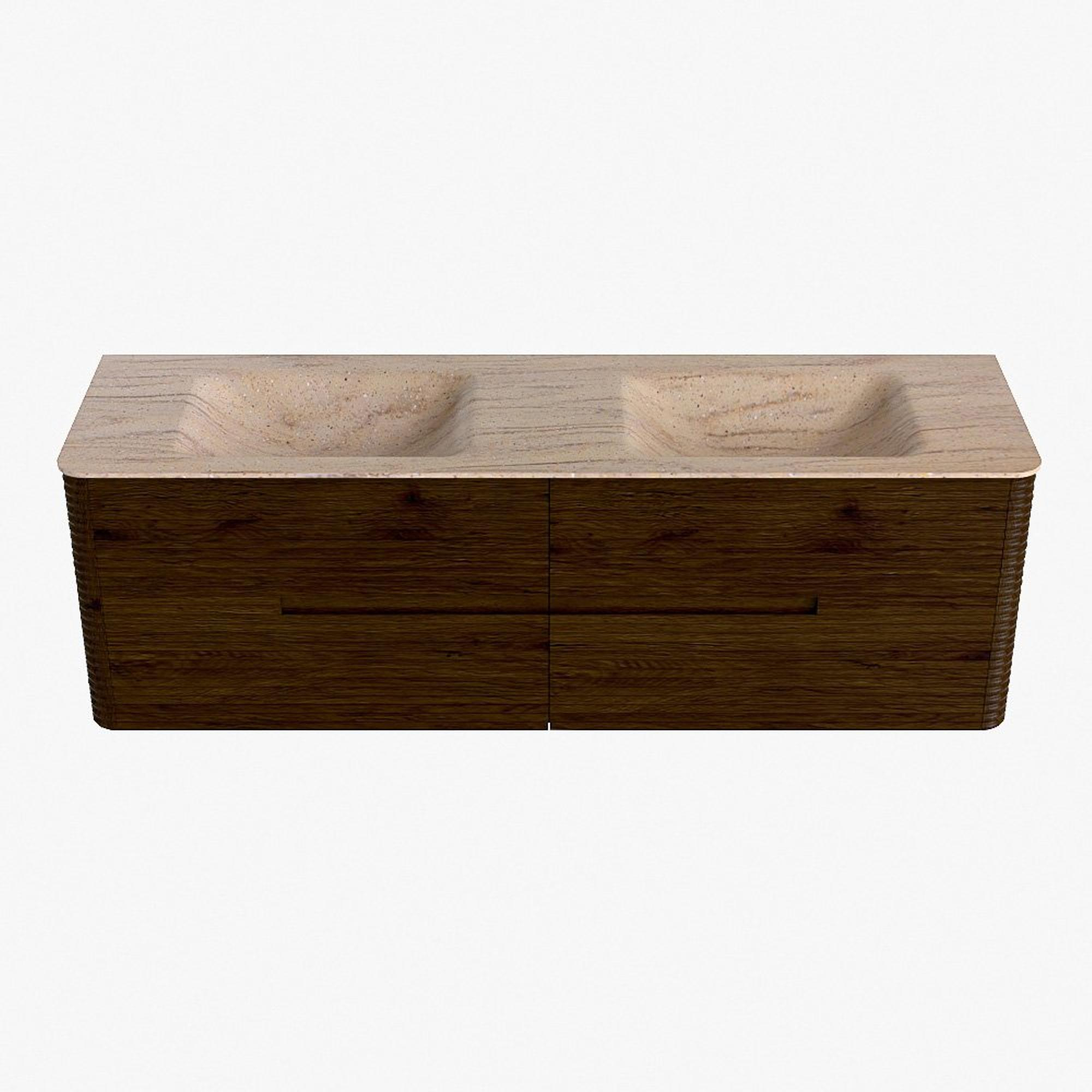 Mondiaz CIRO-DLUX Badkamermeubelset - 160x45x50cm - Solid surface wastafel Saba - 2 wasbak Dubbel - 2 kraangaten - 4 lades - Walnut