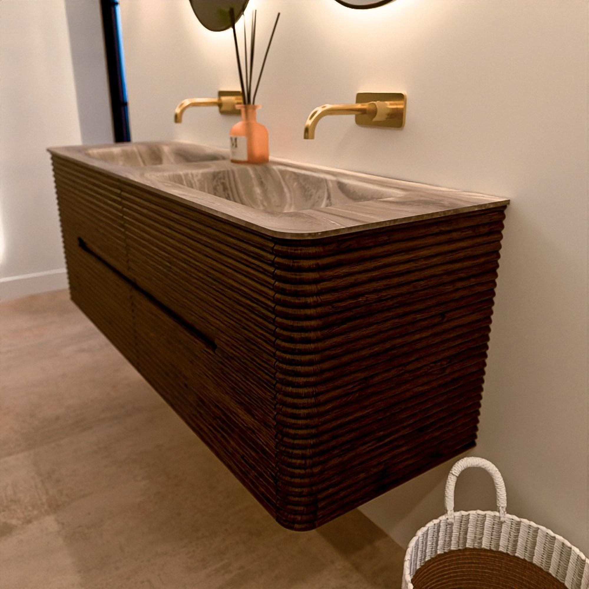 Mondiaz CIRO-DLUX Badkamermeubelset - 140x45x50cm - Solid surface wastafel Sombra - 2 wasbak Dubbel - zonder kraangaten - 4 lades - Walnut