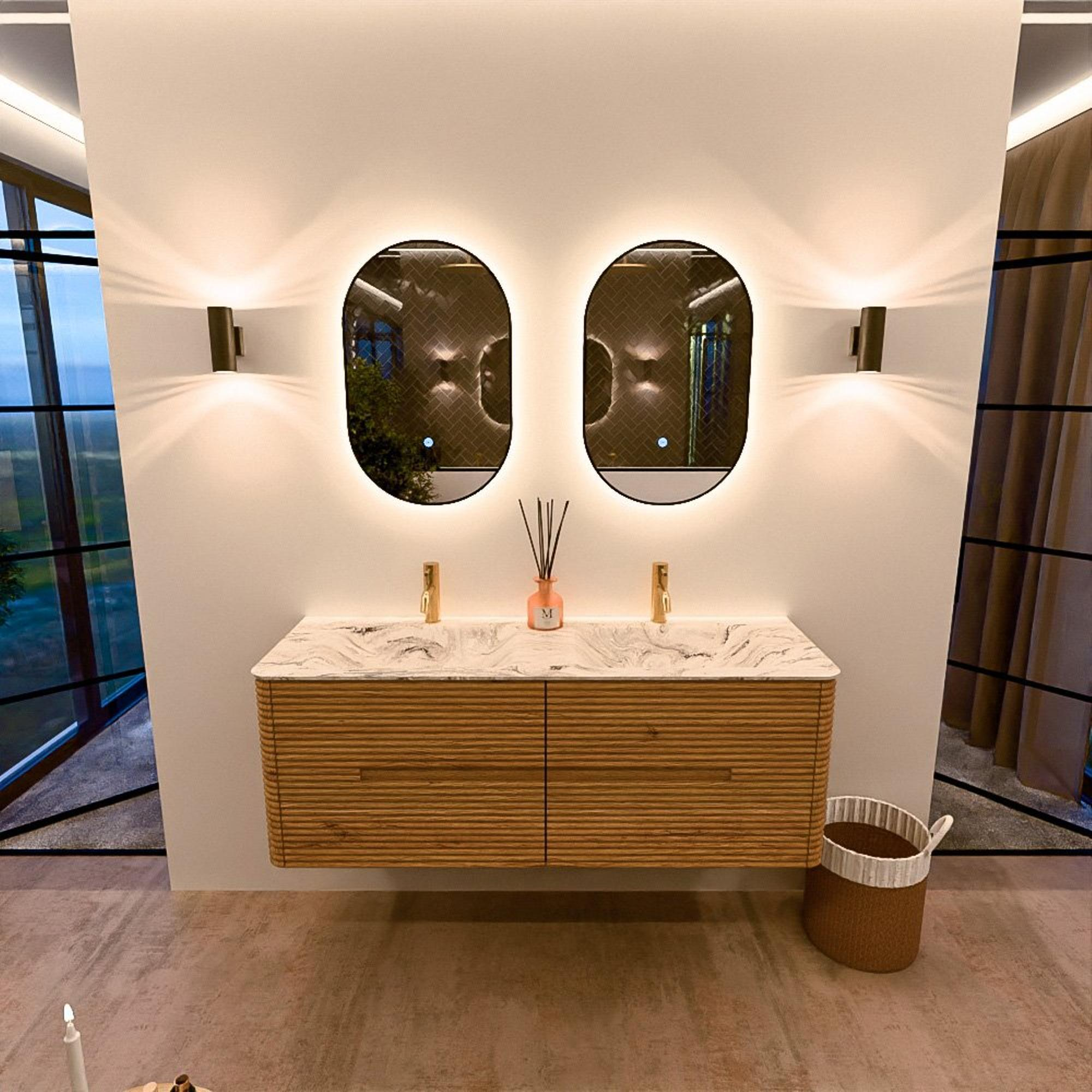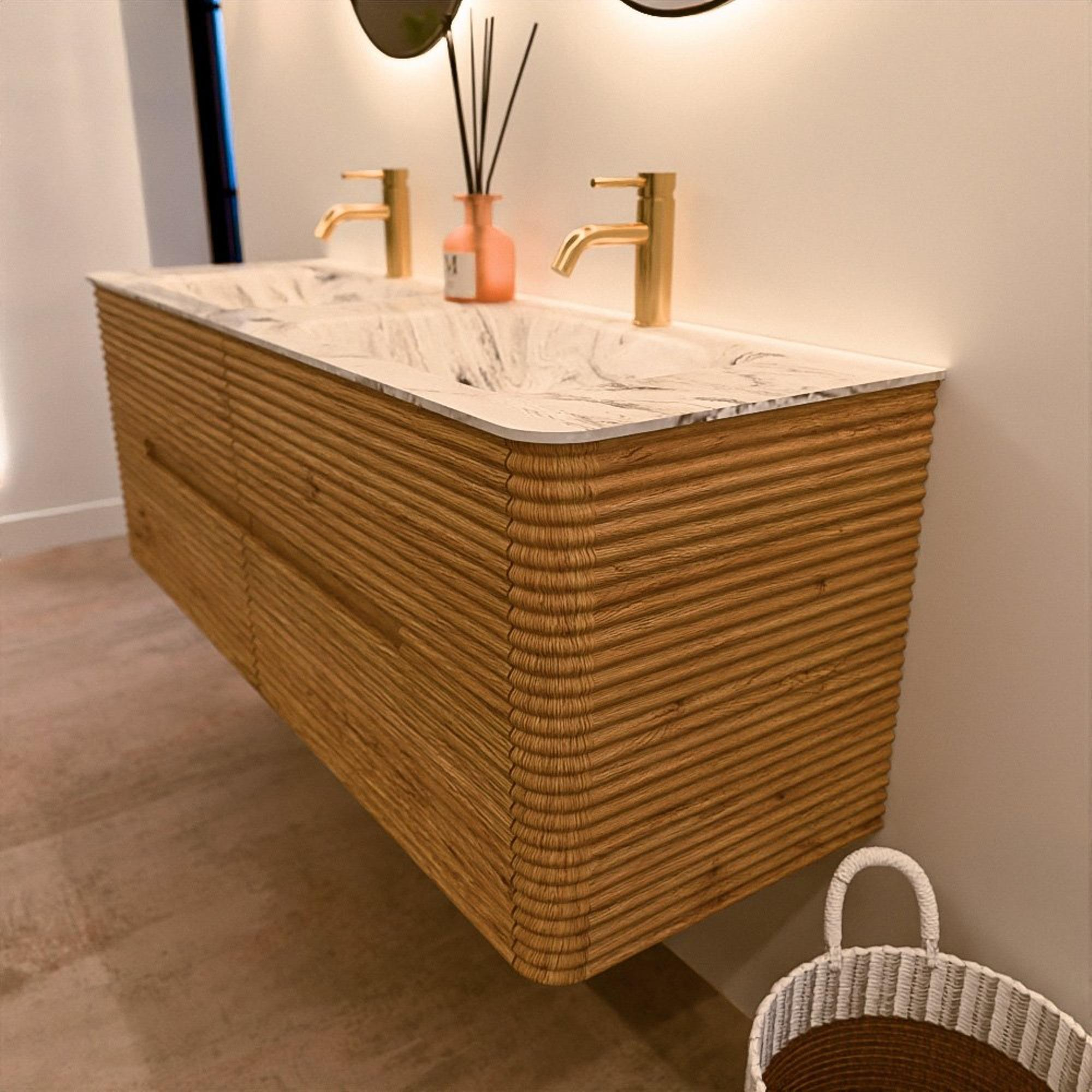 Mondiaz CIRO-DLUX Badkamermeubelset - 140x45x50cm - Solid surface wastafel Glace - 2 wasbak Dubbel - 2 kraangaten - 4 lades - Oak