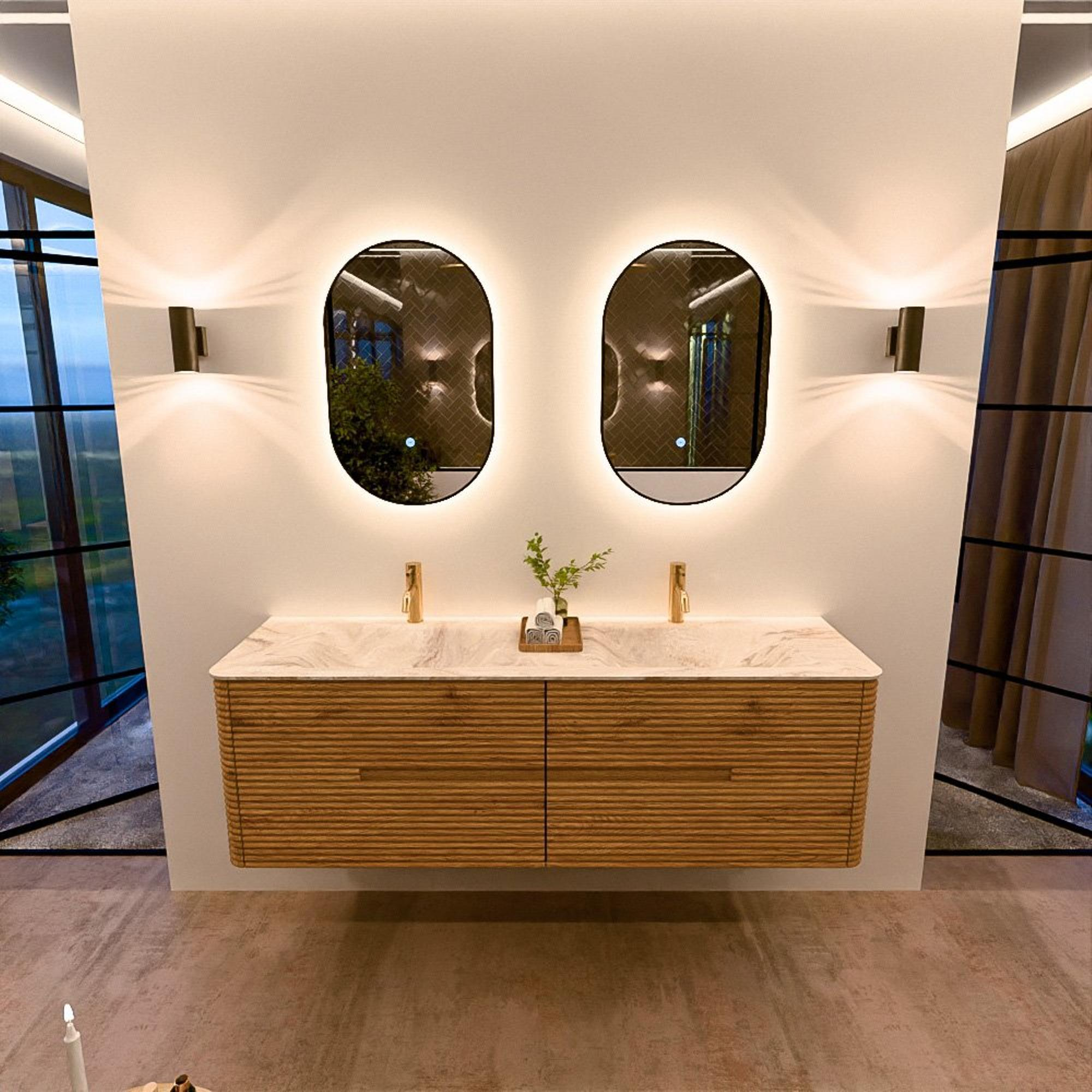 Mondiaz CIRO-DLUX Badkamermeubelset - 160x45x50cm - Solid surface wastafel Frappe - 2 wasbak Dubbel - 2 kraangaten - 4 lades - Oak