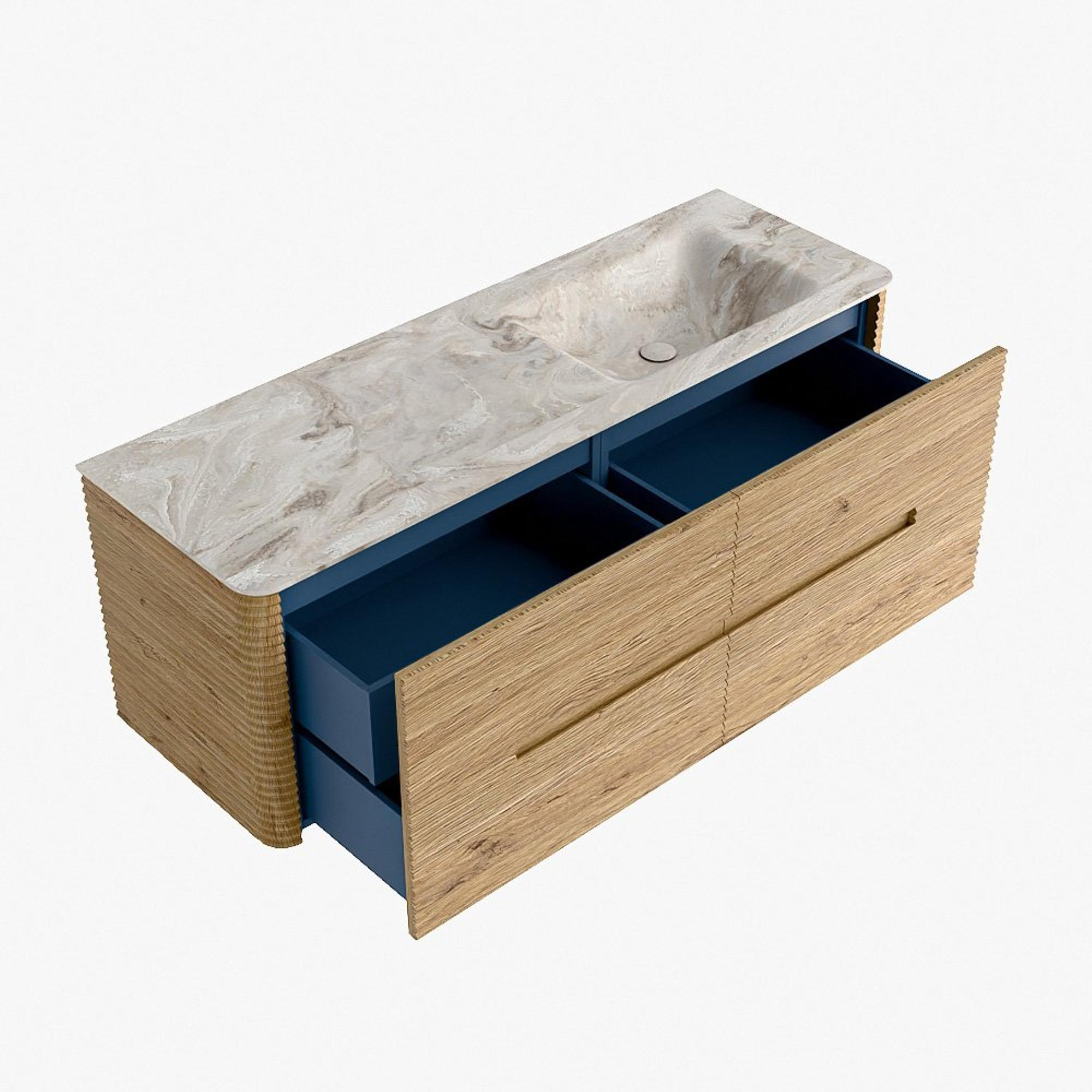 Functioneel gemak is een essentieel onderdeel van de CIRO-serie. Het meubel beschikt over een royale lade met extra binnen lade, ideaal voor het overzichtelijk opbergen van alle dagelijkse badkamerartikelen. Dankzij de geïntegreerde greep en het soft close-mechanisme blijft het front rustig, strak en elegant.