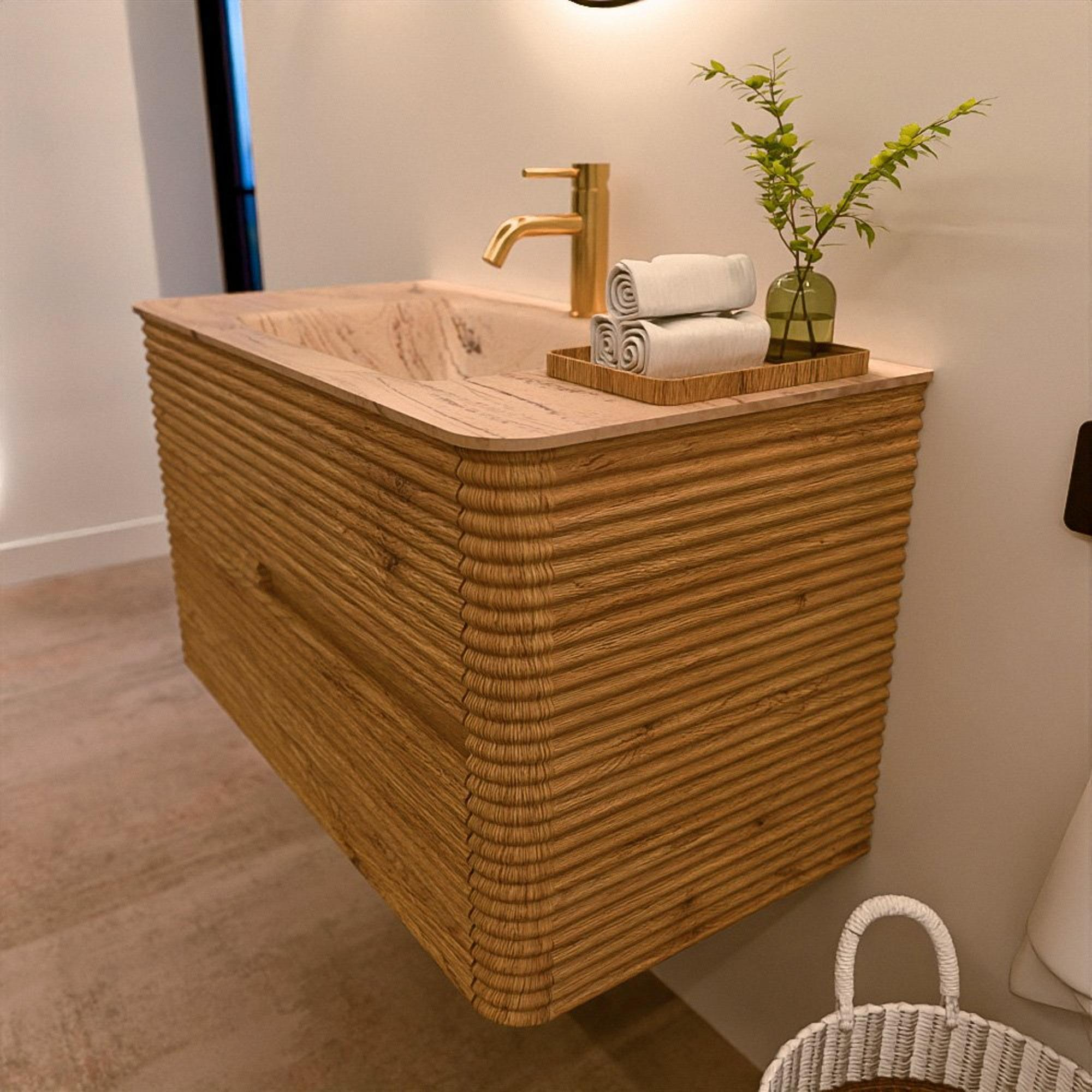 Mondiaz CIRO-DLUX Badkamermeubelset - 90x45x50cm - Solid surface wastafel Arena - 1 wasbak Midden - 1 kraangat - 2 lades - Oak