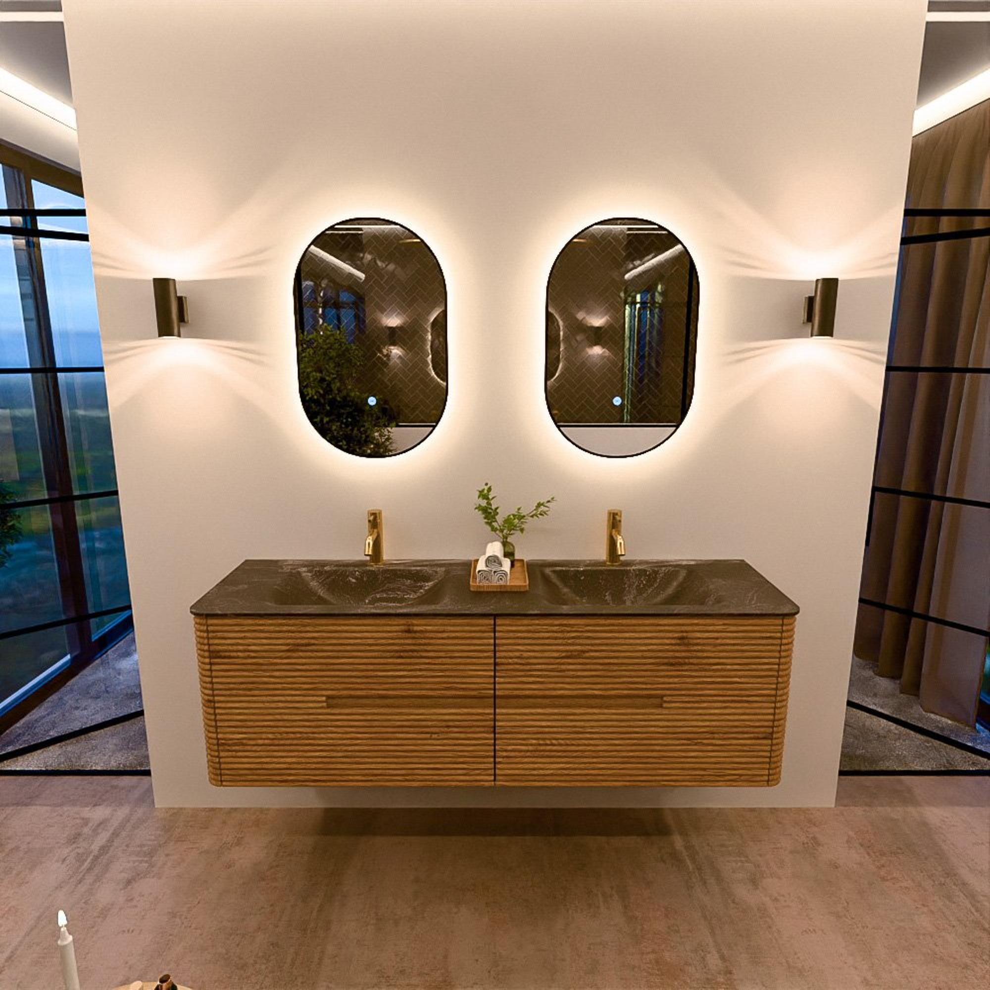 Mondiaz CIRO-DLUX Badkamermeubelset - 160x45x50cm - Solid surface wastafel Lava - 2 wasbak Dubbel - 2 kraangaten - 4 lades - Oak