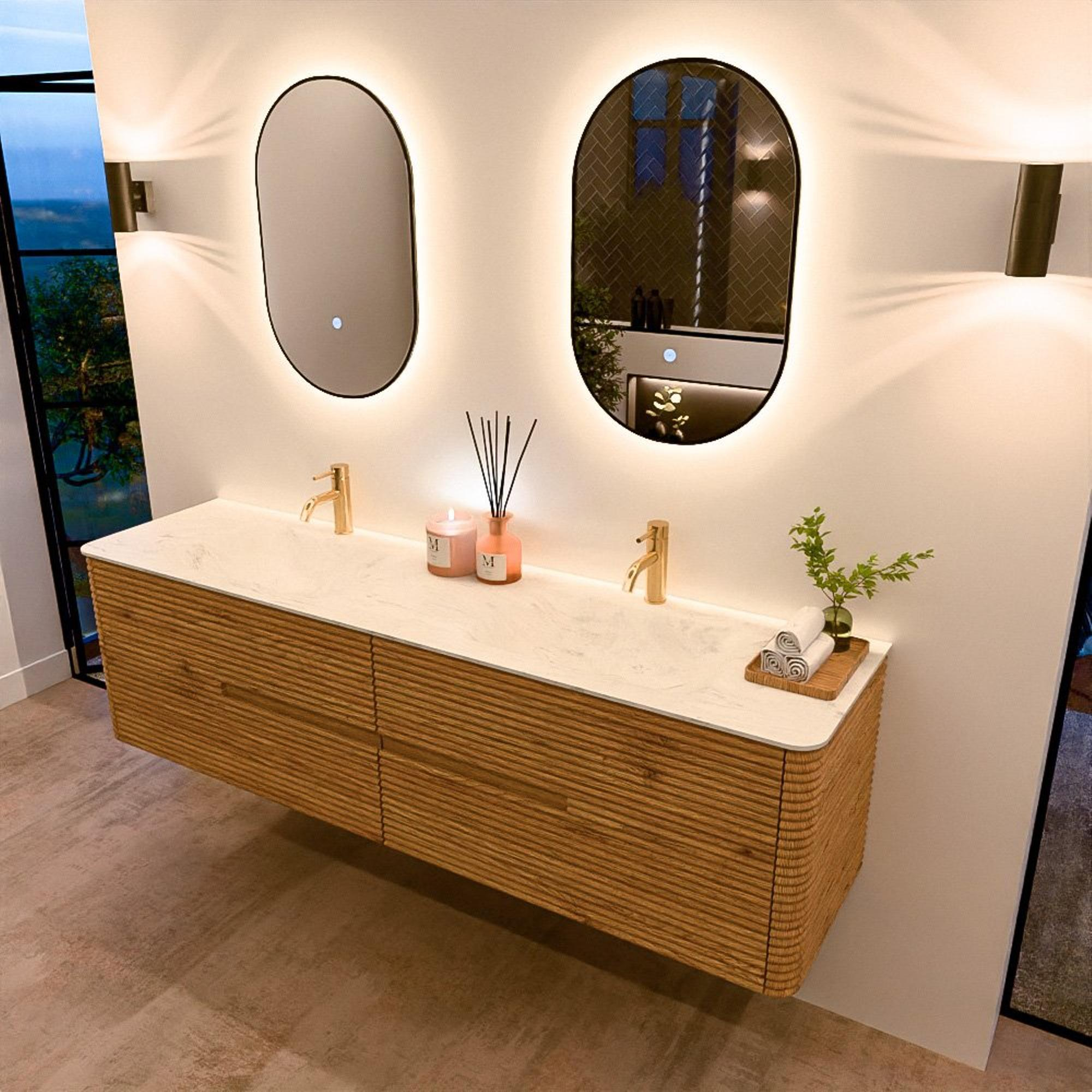 Mondiaz CIRO-DLUX Badkamermeubelset - 180x45x50cm - Solid surface wastafel Opalo - 2 wasbak Dubbel - 2 kraangaten - 4 lades - Oak