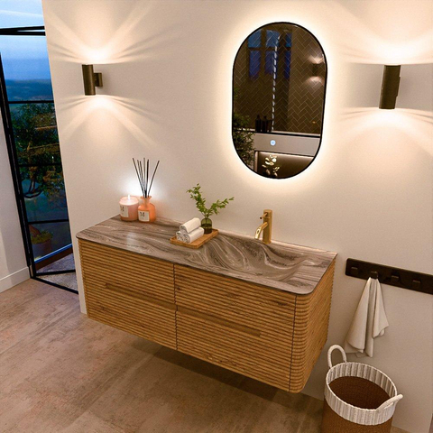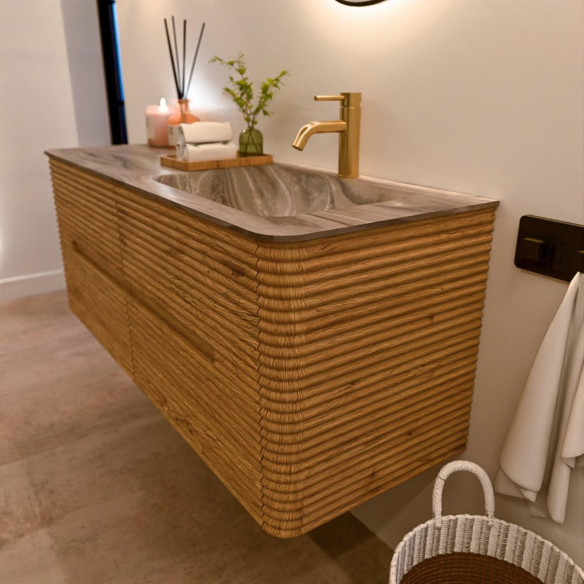 Mondiaz CIRO-DLUX Badkamermeubelset - 130x45x50cm - Solid surface wastafel Sombra - 1 wasbak Rechts - 1 kraangat - 4 lades - Oak