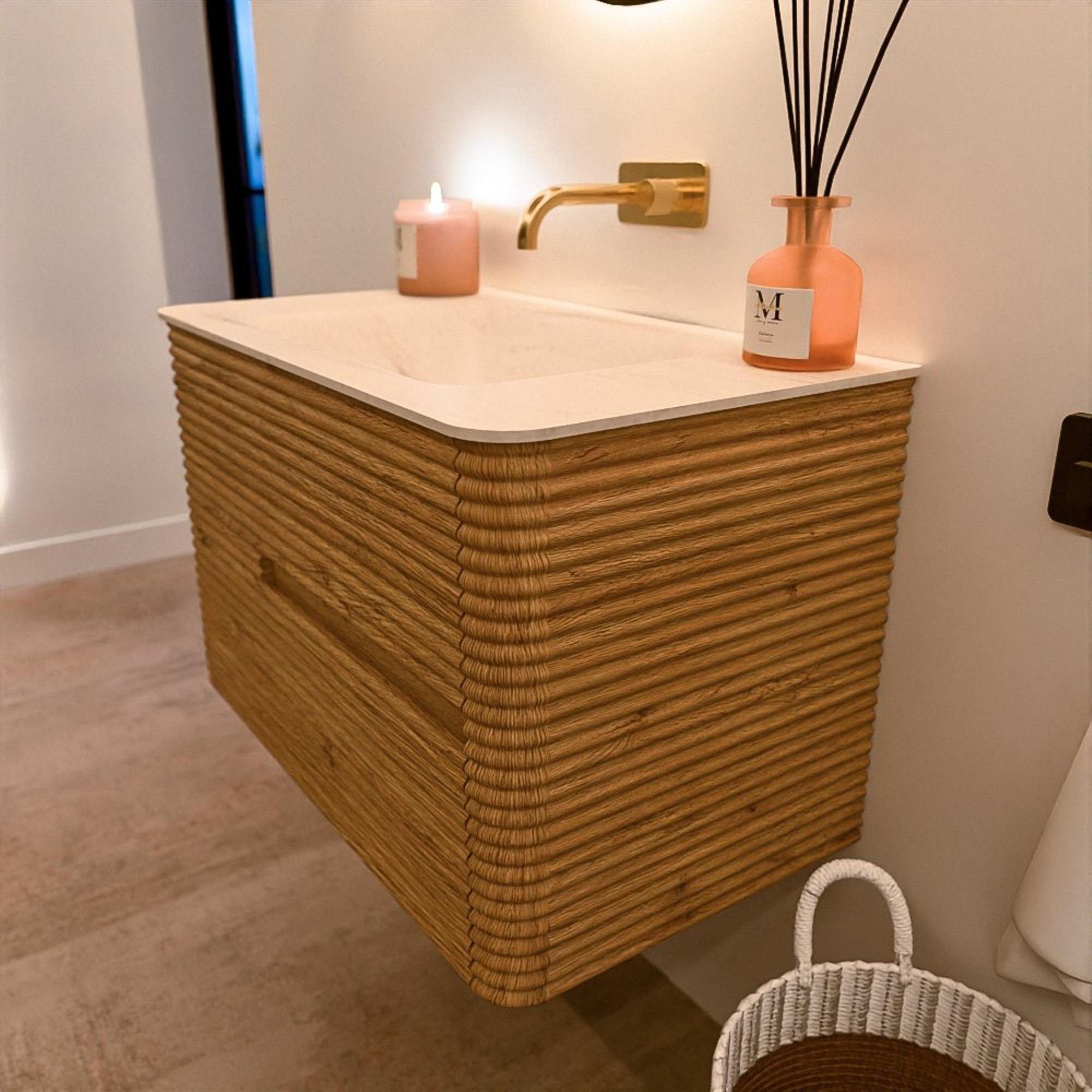 Mondiaz CIRO-DLUX Badkamermeubelset - 80x45x50cm - Solid surface wastafel Meli - 1 wasbak Midden - zonder kraangaten - 2 lades - Oak
