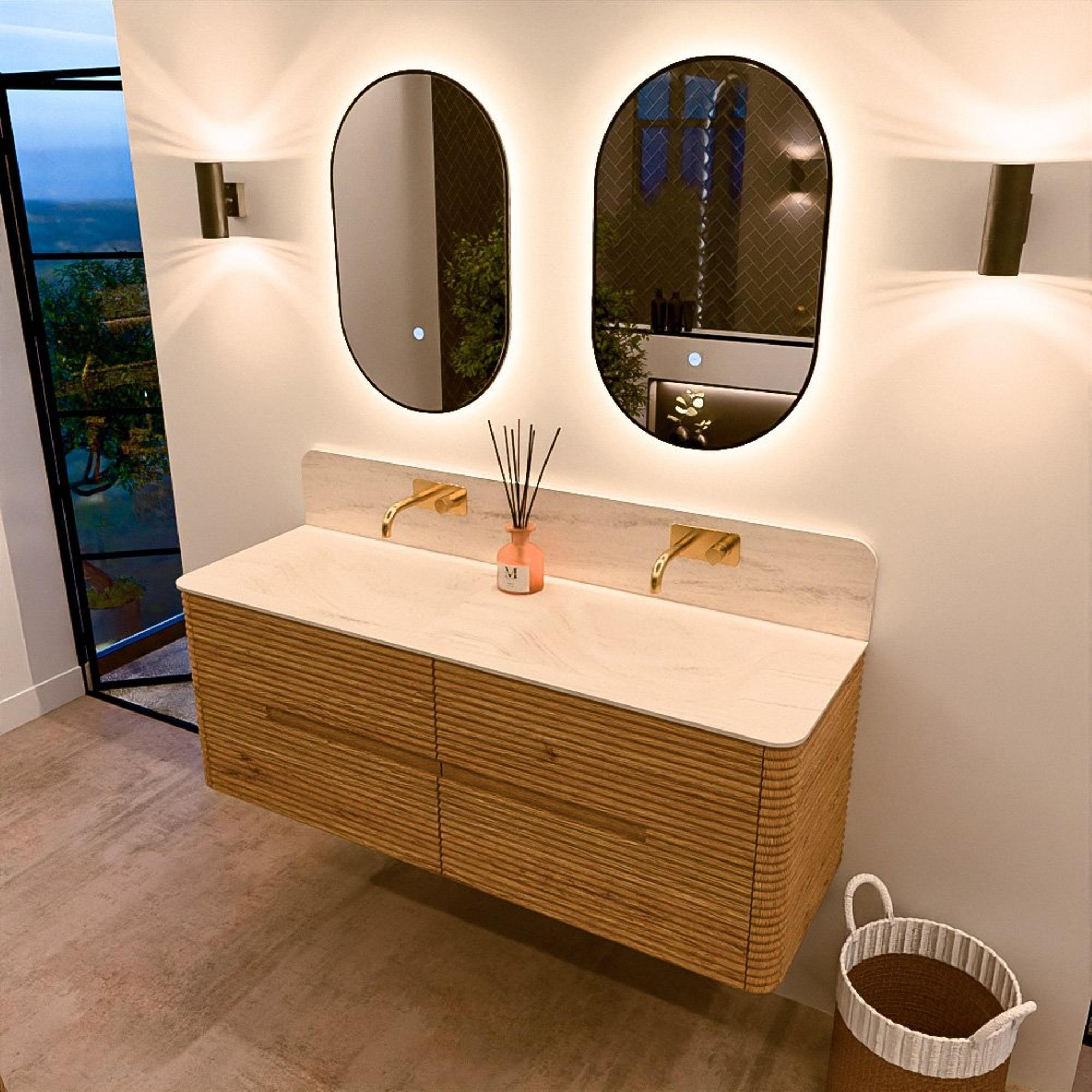 Mondiaz CIRO-DLUX Badkamermeubelset - 140x45x50cm - Solid surface wastafel Meli - 2 wasbak Dubbel - zonder kraangaten - 4 lades - Oak