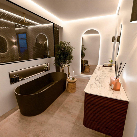 De wastafels van de CIRO-lijn worden vervaardigd uit hoogwaardig Solid Surface, een materiaal dat bekendstaat om zijn strakke uitstraling, hygiënische eigenschappen en uitstekende duurzaamheid. De wastafels zijn beschikbaar in 11 marmer- en travertin tinten, waarmee je het luxueuze karakter van natuursteen combineert met de voordelen van Solid Surface. De organische vorm van de kom versterkt het serene, sculpturale karakter van het ontwerp.